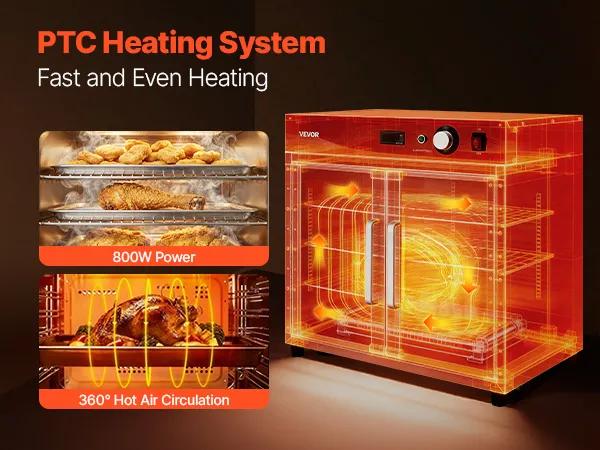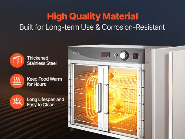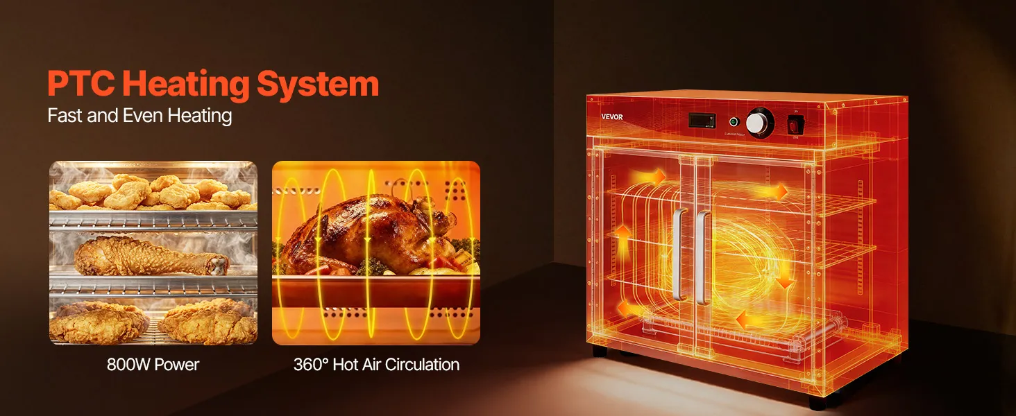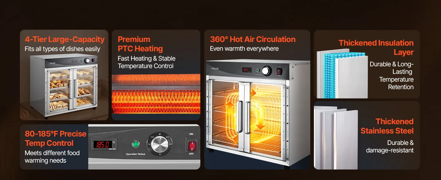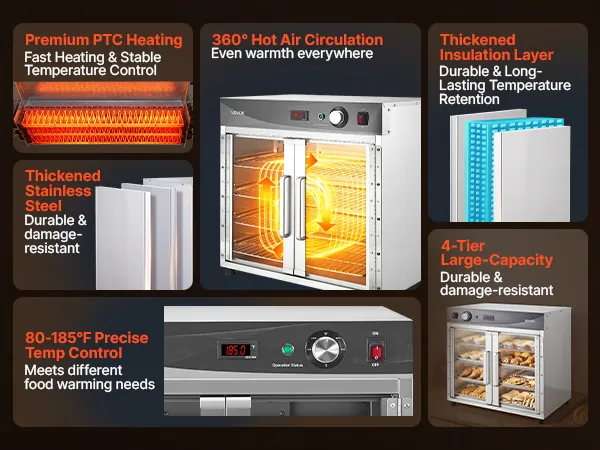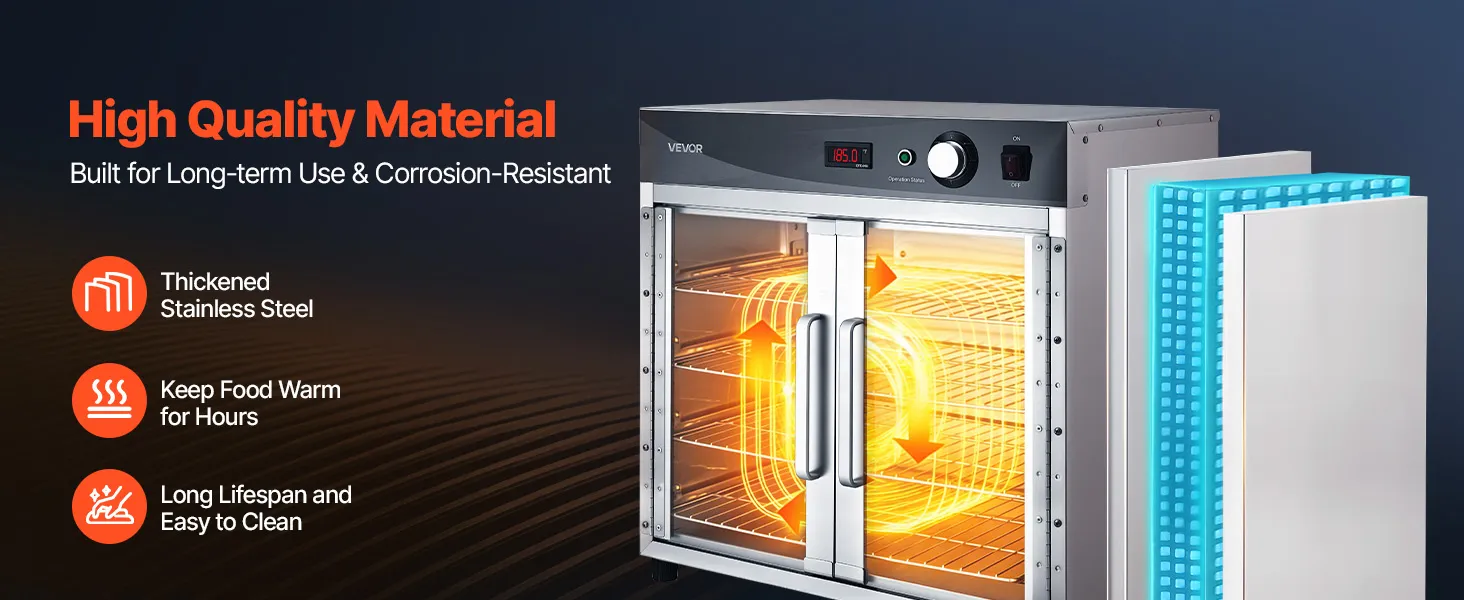 Superior Insulation & Visibility: Constructed with thickened stainless steel and a tight door seal to minimize heat loss. The double-layer tempered glass enhances insulation while providing clear visibility. 360° hot air circulation ensures even heating and energy efficiency for reliable holding