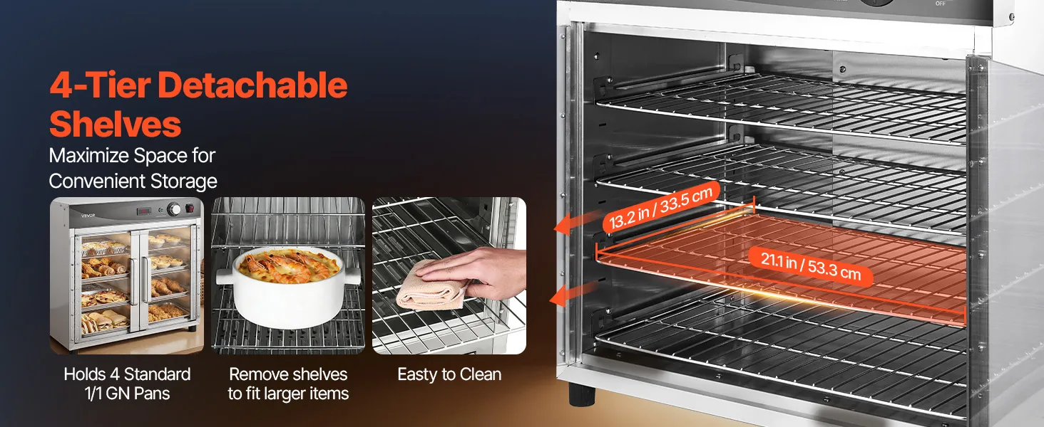 4-Layer Flexible Capacity: Features four sturdy, removable shelves with 3.7 inch/9.5 cm clearance per tier, designed to accommodate 13 inch pizzas, full-size hotel pans, multiple 1/2 and 1/3 trays, foil pans, or deli boards. The adjustable shelving allows for custom configurations to fit taller items