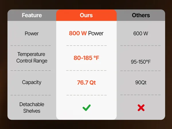 Precise Control with Added Protection: Offers adjustable temperatures from 80°F to 185°F, featuring auto shut-off and overheat protection. Includes a removable water tray to prevent food from drying out or scorching