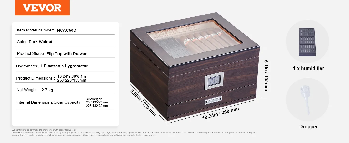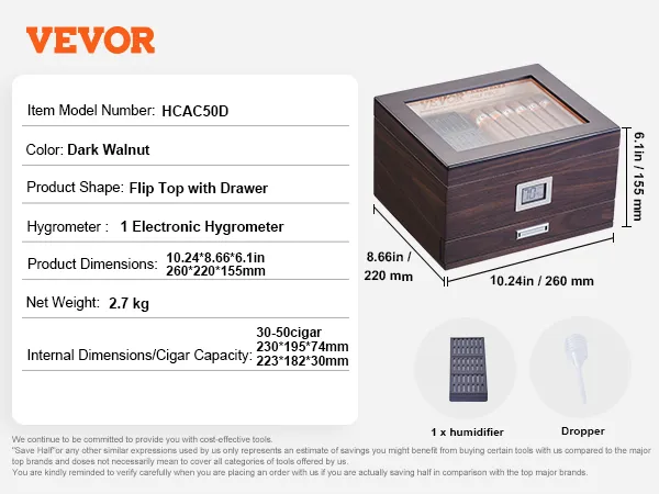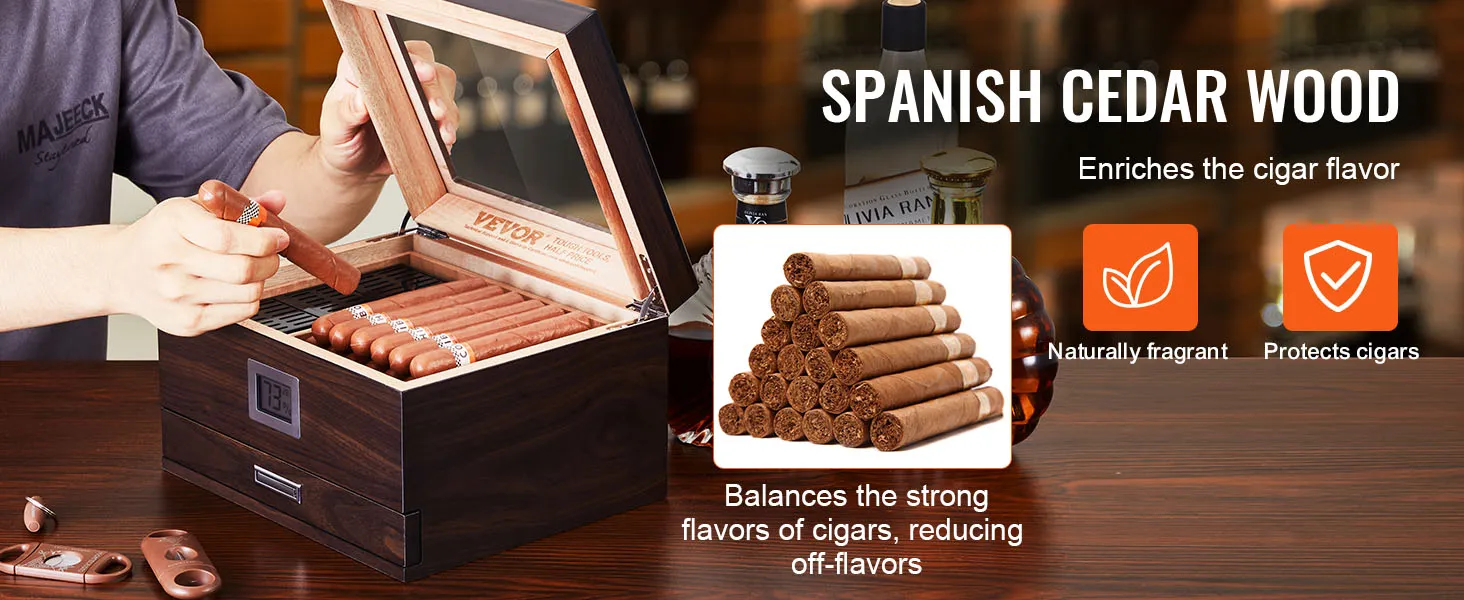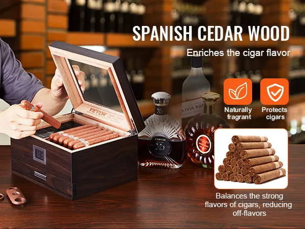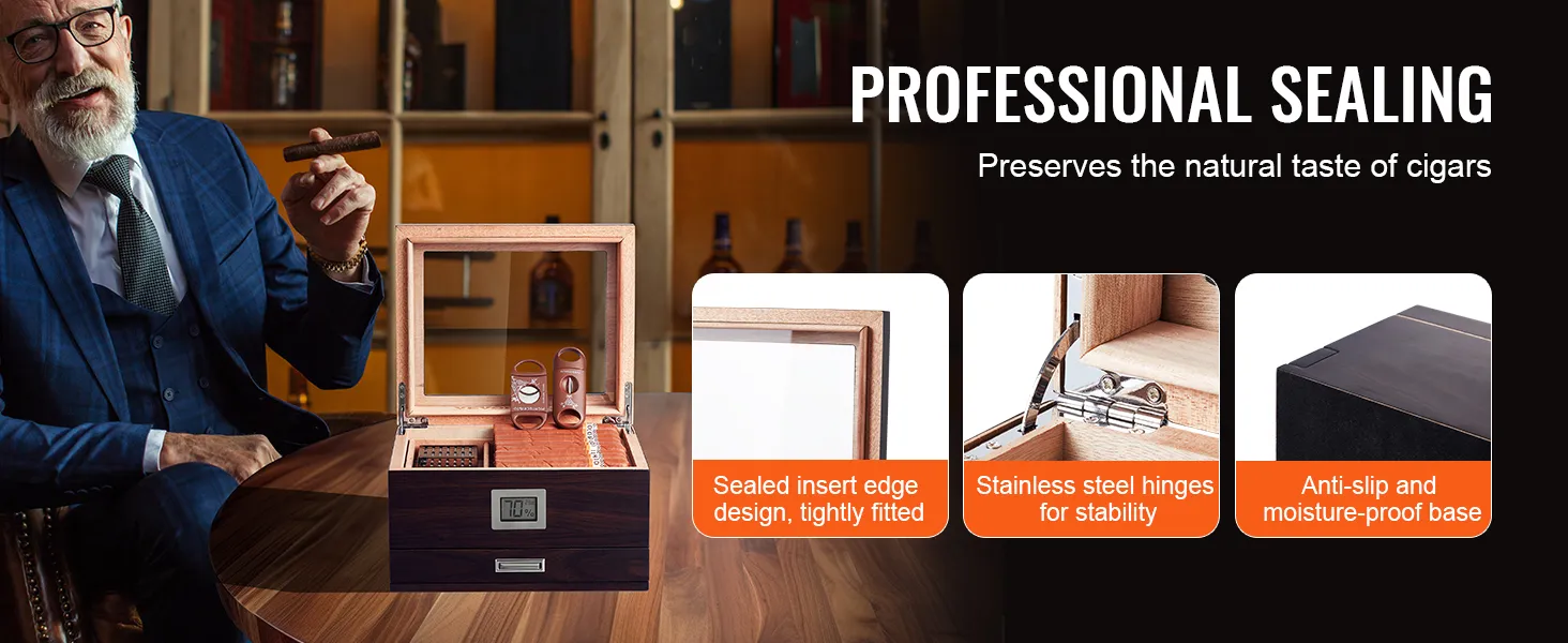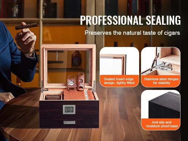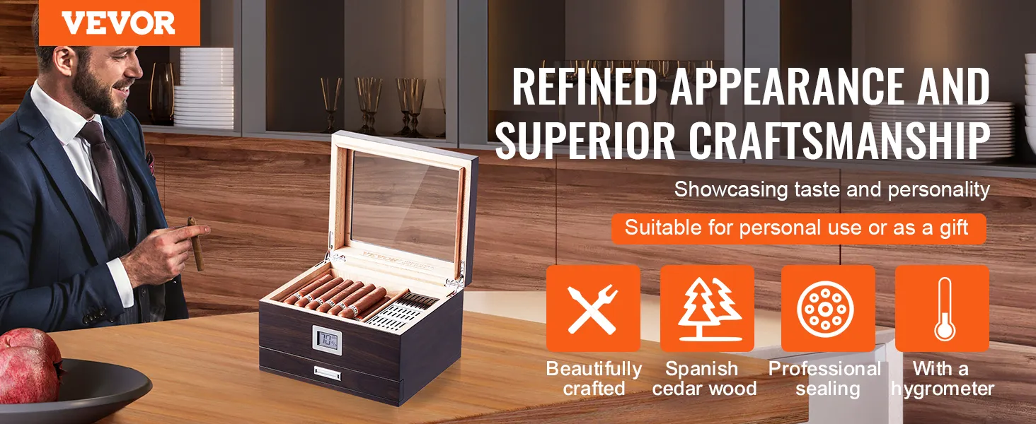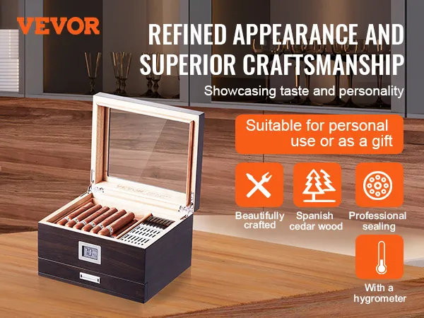 The VEVOR 50 cigar humidor is made from premium Spanish cedar wood. This wood maintains the ideal humidity for your cigars. It also enhances their flavor and aroma. The humidor is perfect for storing and aging cigars. With its high-transparency glass, you can easily monitor your smoking habits. You can monitor your smokes at all times. Seal edge design ensures a snug fit while keeping your cigarette's freshness secure. Stainless steel hinges provide stability and durability. Each humidor is meticulously designed, ensuring longevity and reliability.