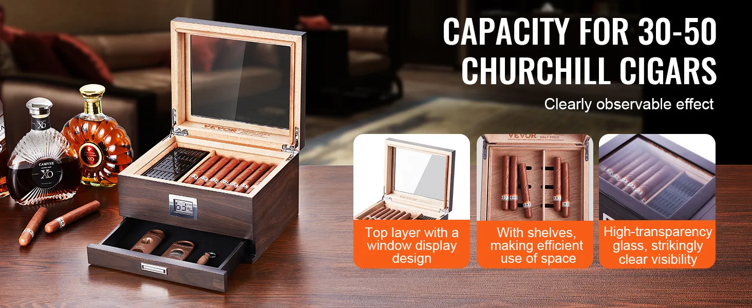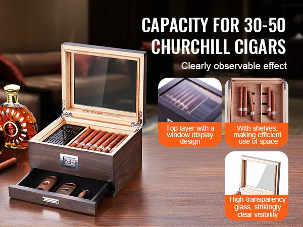This cigar humidifier has adjustable shelves. This allows you to have the maximum storage flexibility. You can move and assemble the shelves according to your needs. This feature allows you to store 30-50 Churchill cigars efficiently. The dark walnut-colored lid design adds to its elegance. In addition, there is a drawer at the bottom that will store cigar accessories. Whether you are a brave or casual smoker, this humidor meets all your storage needs!