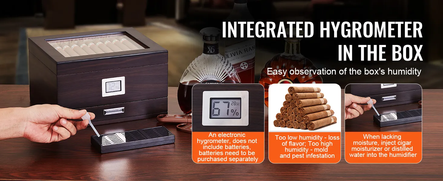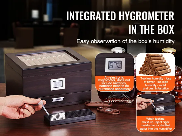 Visible Humidity: The cedar cigar desktop box is equipped with a hygrometer for observing the humidity levels inside the humidor. When moisture is lacking, cigar humidifying solution or distilled water can be added to the humidifier, maintaining the humidity levels inside the humidor for better storage and aging of cigars.