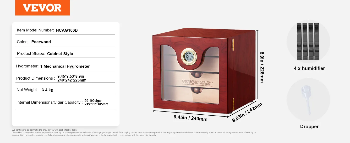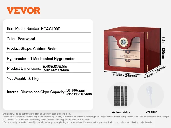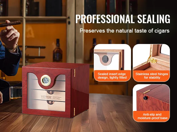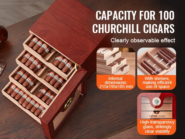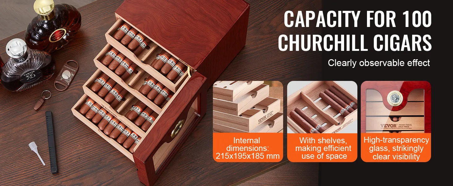 The VEVOR 100 cigar humidor is ideal for large collections. With internal dimensions of 215x195X185mm, it can hold 50-100 Churchill cigars. The movable hollow partition allows for layered and partitioned storage. This helps in effectively utilizing the storage space. You can store various cigar flavors with similar tastes together. There's also plenty of room for cigar accessories. Keep everything you need in one organized place. It has a large capacity that makes it perfect for both casual smokers and enthusiasts.