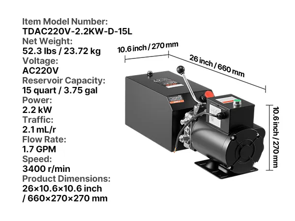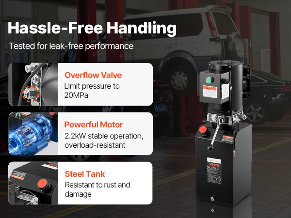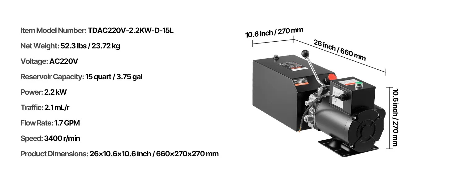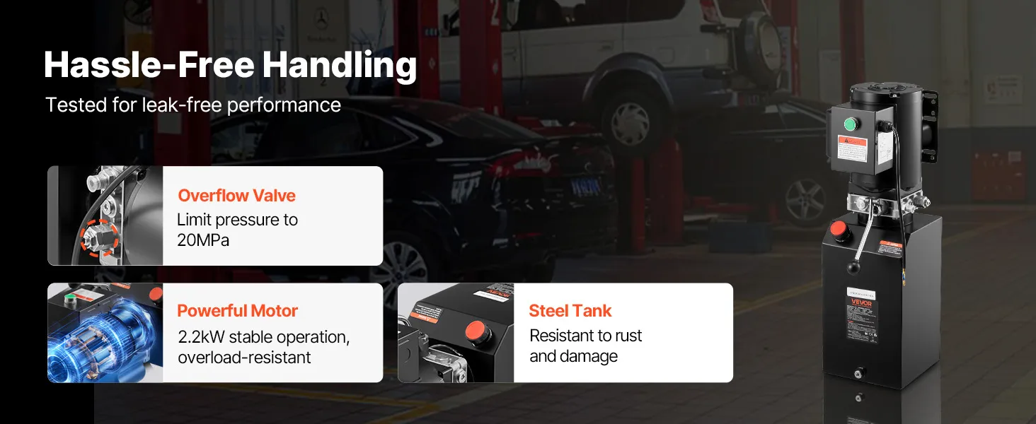 Powerful Performance: This hydraulic pump features a 220V, 2.2kW motor with 1.7GPM flow and a 15-quart tank, delivering an impressive oil pressure range of 16-20Mpa, effortlessly lifting heavy vehicles and equipment