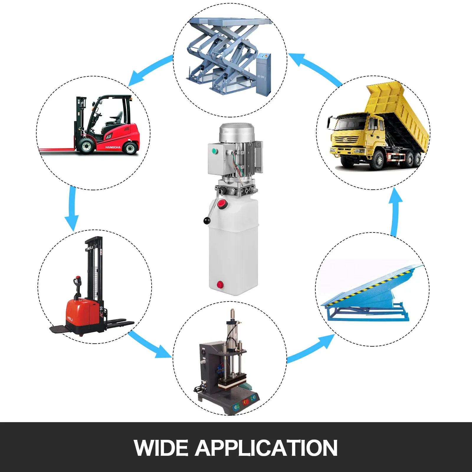 Hydraulic dump used in applications where extending a hydraulic cylinder is needed, truck tailgate lift, RV leveling, scissor lift, dump trailer, lift truck, snowplow, aerial platform, road signs, material handling, wheelchair lifts, etc.
