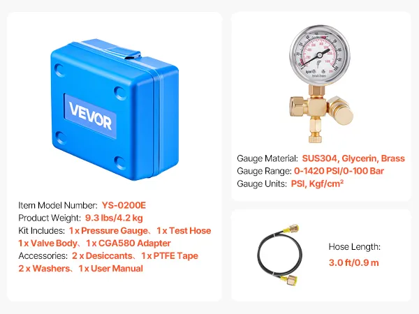 Nitrogen Filling & Hydraulic Testing: This hydraulic pressure test kit measures 0-1420 PSI/0-100 Bar. It includes a pressure gauge, a hose, an adapter coupling, and a nitrogen filling connector