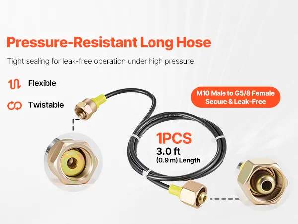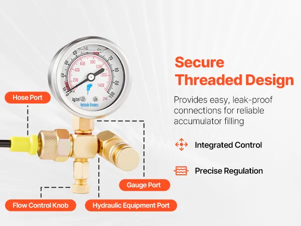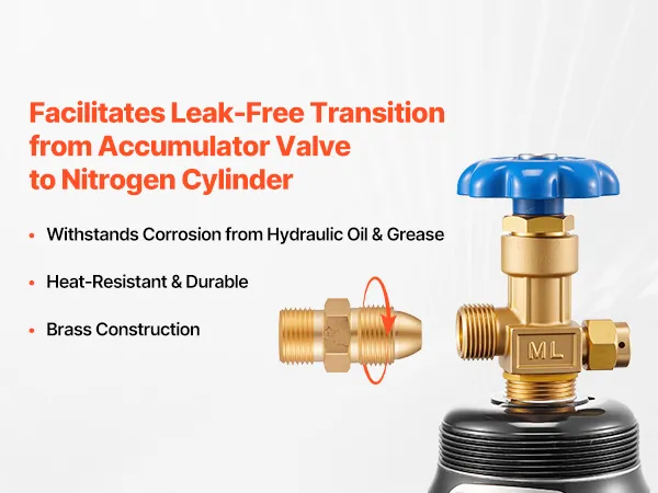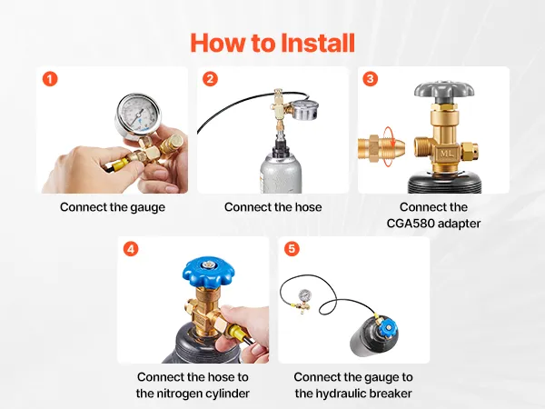 Wide Compatibility: The hydraulic gauge kit's nitrogen charging valve body is designed for accumulator filling. The G5/8 to CGA580 adapter fits major hammer/breaker brands. 3 ft hose with M10 male and G5/8 female threads for easy connection