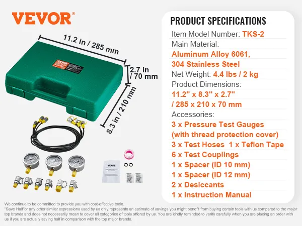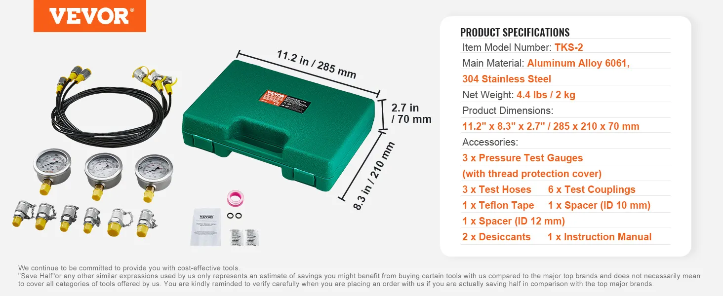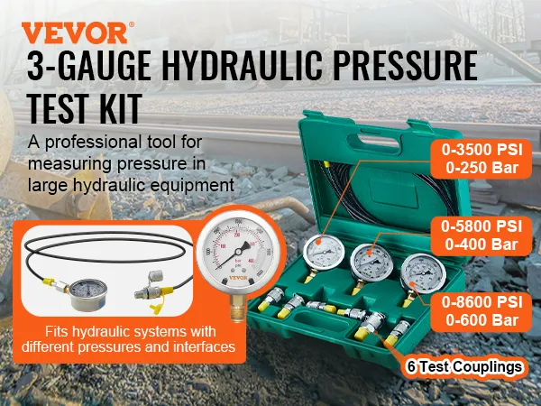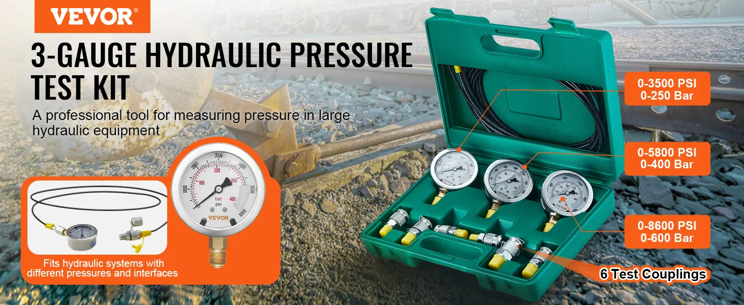The VEVOR's hydraulic test gauge set provides a comprehensive collection of pressure gauge options. This kit includes three gauges: 0-3500 PSI, 0-5800 PSI, and 0-8600 PSI. These are all useful tools for different hydraulic equipment. It doesn’t matter if you work on excavators or tractors; the kit can handle it. The kit has accurate and reliable gauge levels that ensure you get the right readings every time. So, it is an excellent addition to your toolset for professional testing needs. This toolkit covers various machinery and equipment.