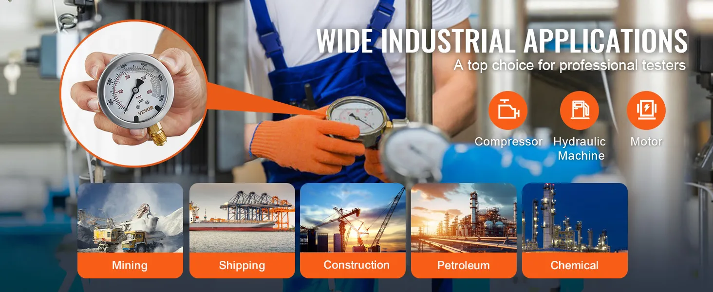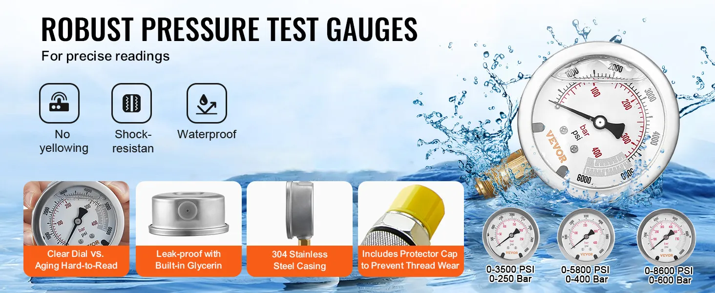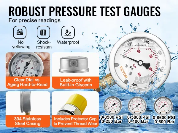 The VEVOR hydraulic test gauge set is built to last. Made from strong 304 stainless steel, it can withstand high temperatures and corrosive areas. The dial seal design prevents glycerin leakage, discoloration, and hardening. This reduces internal friction and improves accuracy. Its durability ensures you can trust these gauges for long-term use. The construction ensures that the gauges can handle tough conditions while maintaining precision and reliability.