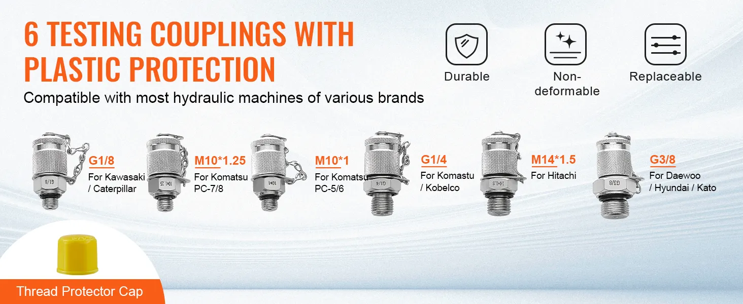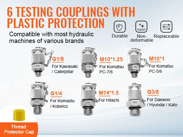 What's the best part of this excavator hydraulic test kit for excavators? It includes six test couplings: G1/8, G3/8, M141.5, M101, M101.25. You can use these couplers with various excavator models. This flexibility means you can use the kit on different machines without needing additional adapters. The thread joints feature a protective plastic film to prevent damage and ensure secure connections. So, it is an incredibly versatile tool for construction and maintenance tasks.