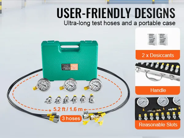 The kit comes with three 5.2-foot test hoses. These hoses make it easy to place the pressure gauges within the machinery. This allows for easy reading and accurate measurements. A plastic carrying case neatly organizes all testing components. It is compact and saves storage space. Also, it allows you to easily transport the kit. The case keeps everything organized and ready for use. So, this makes it convenient for professionals who need to move between different job sites.