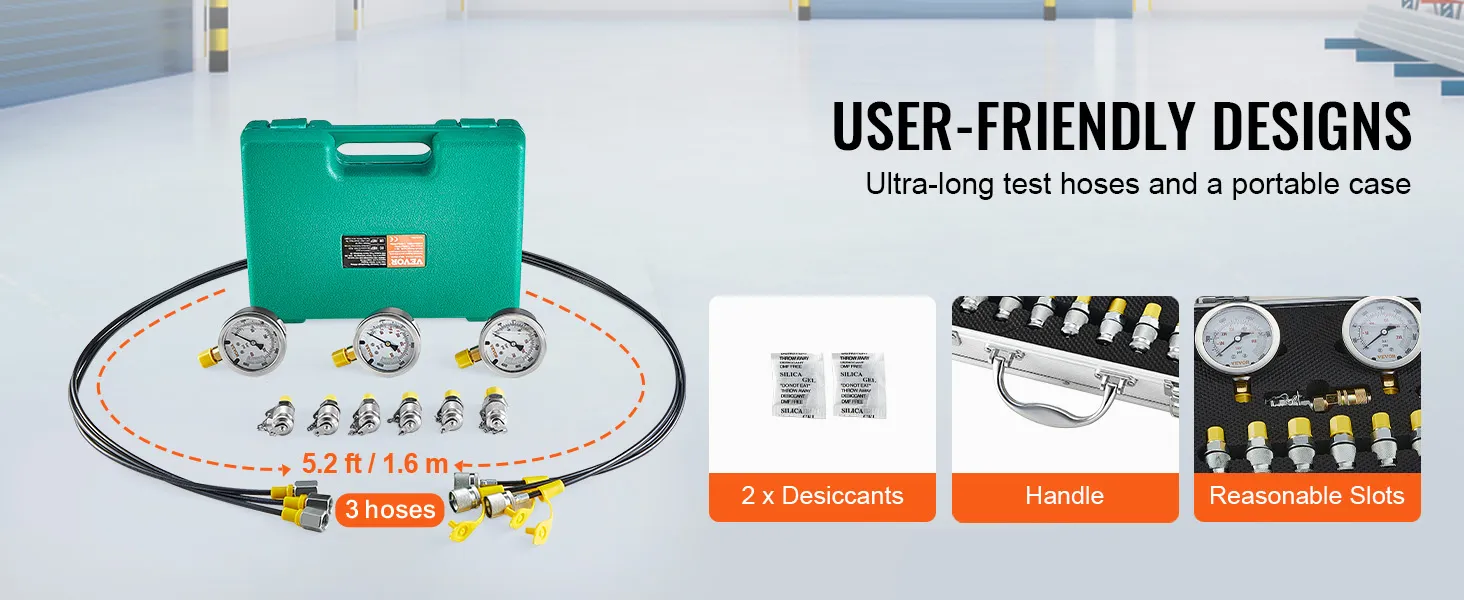 It is perfect for various types of large hydraulic equipment. You can use this hydraulic test kit for tractors, excavators, hydraulic presses, cranes, compressors, and more. The kit is suitable for construction, shipping, mining, smelting, and maintenance tasks. This versatility makes it an ideal choice for professional testing needs in different industries. No matter if you're working on heavy machinery or industrial equipment, this kit will help you ensure accurate pressure readings while maintaining optimal performance.