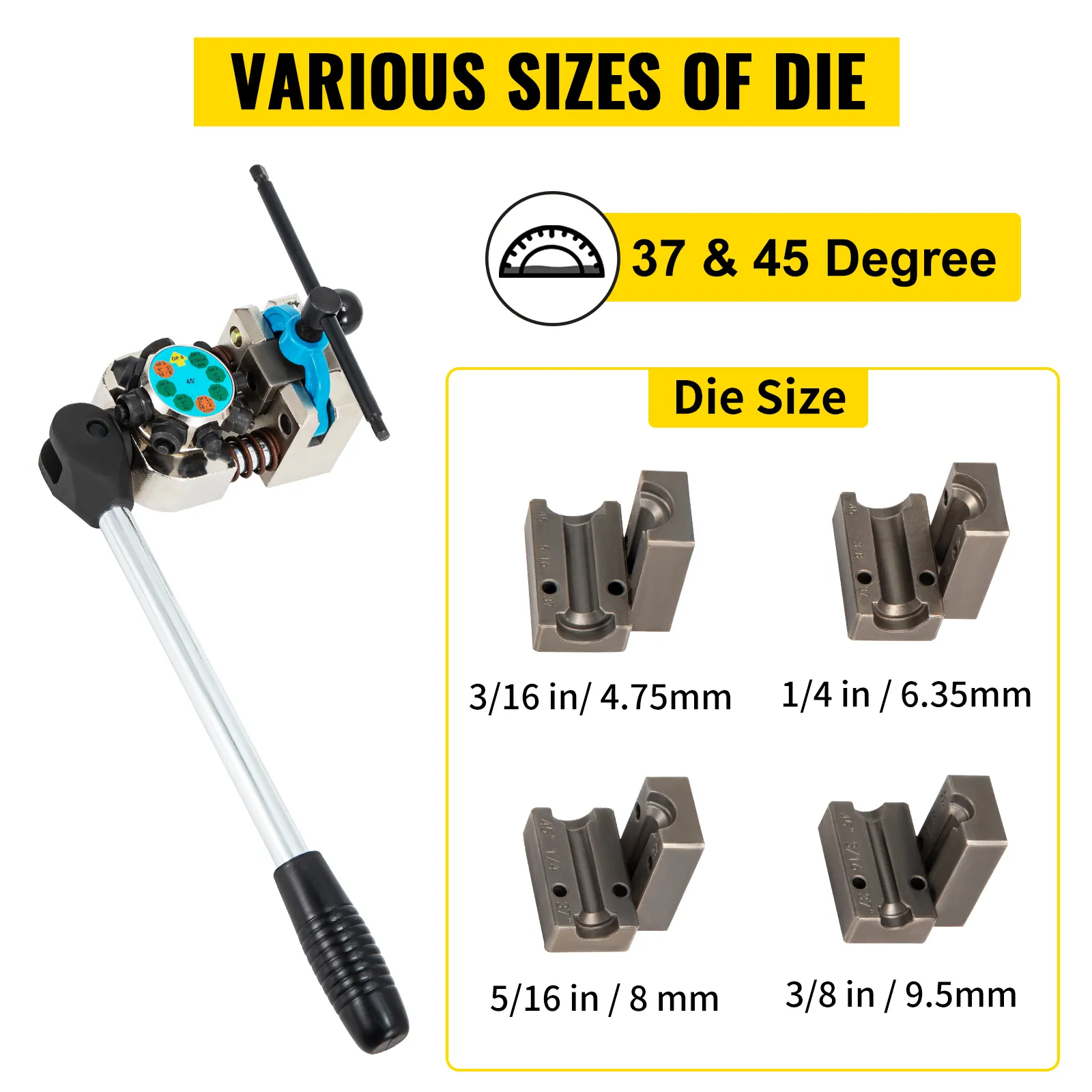 - Dies Size: 3/16 inch (4.75 mm), 1/4 inch (6.35 mm), 5/16 inch (8 mm), 3/8 inch (9.5 mm)