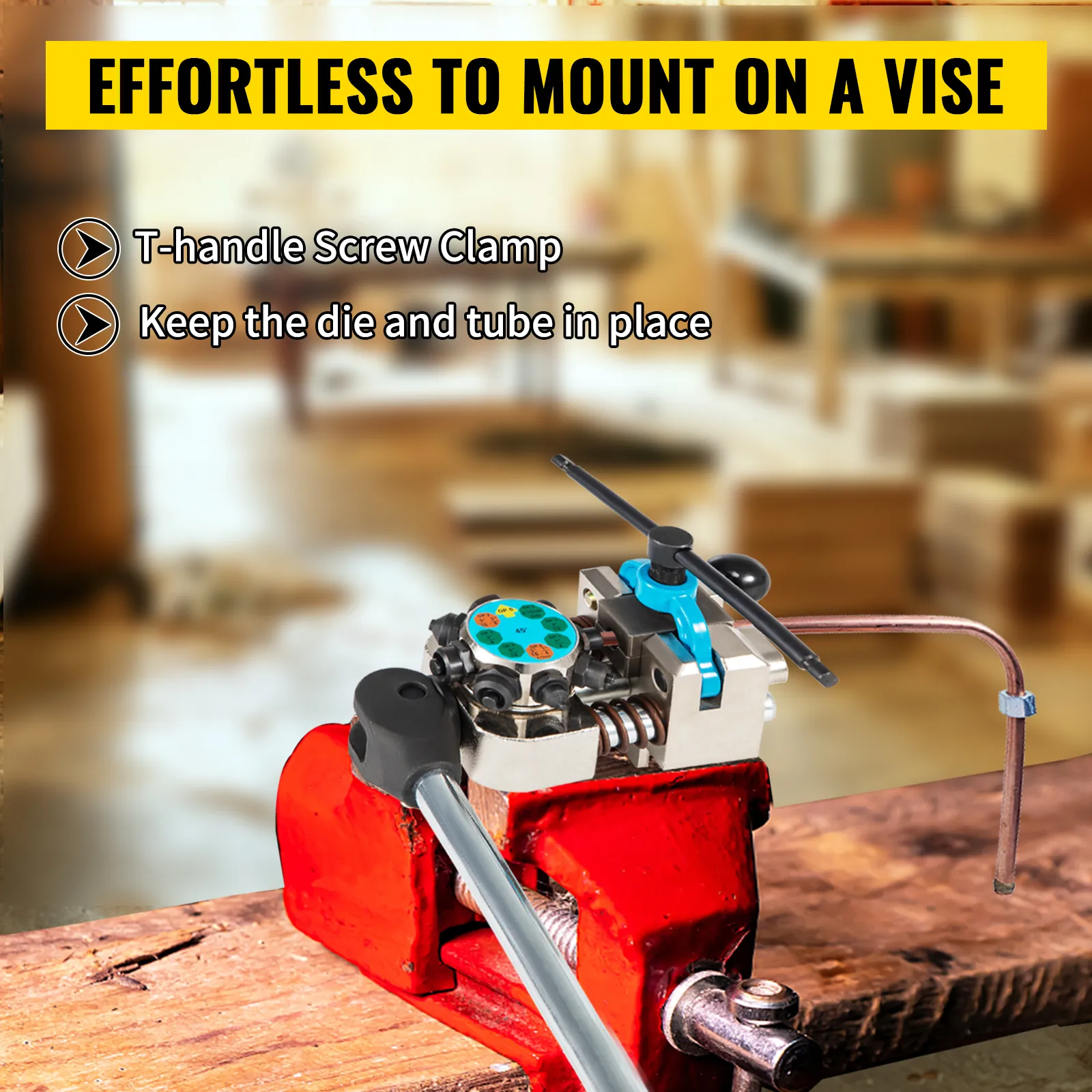 Our professional brake line flaring tool is designed to be mounted on a bench-mount or hitch-mount vise. The T-handle screw clamp keeps the die and tube in place firmly.