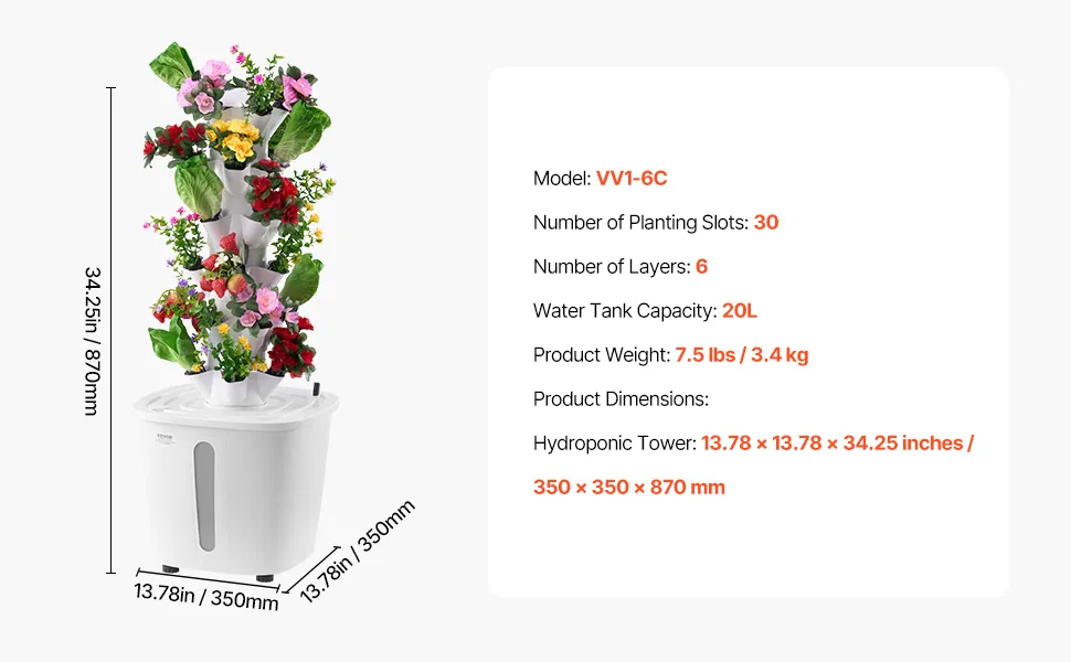 Space-Saving, Efficient Growing: Featuring a 6-tier vertical design with 30 planting pods, this hydroponic tower measures just 13.78 x 13.78 x 34.25 inches. Ideal for kitchens, balconies, and small apartments, it maximizes space and allows you to grow efficiently while enjoying a green lifestyle.