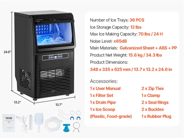 VEVOR Commercial Ice Maker Machine, 70lbs/24H Ice Maker Machine with 12lbs Storage Capacity, 36 Ice Cubes in 15 Minutes, LED Digital Display Freestanding Self-Cleaning for Bar Office Restaurant