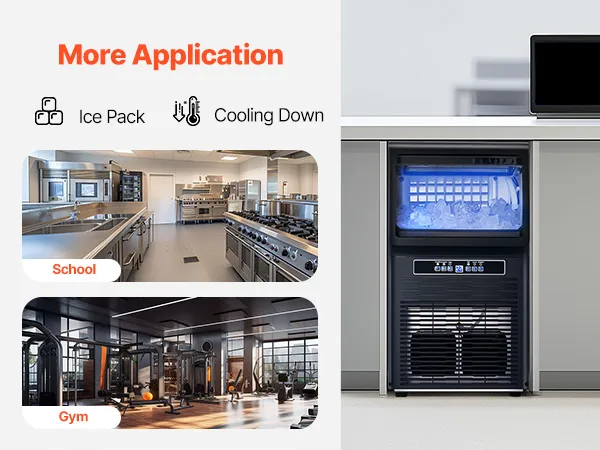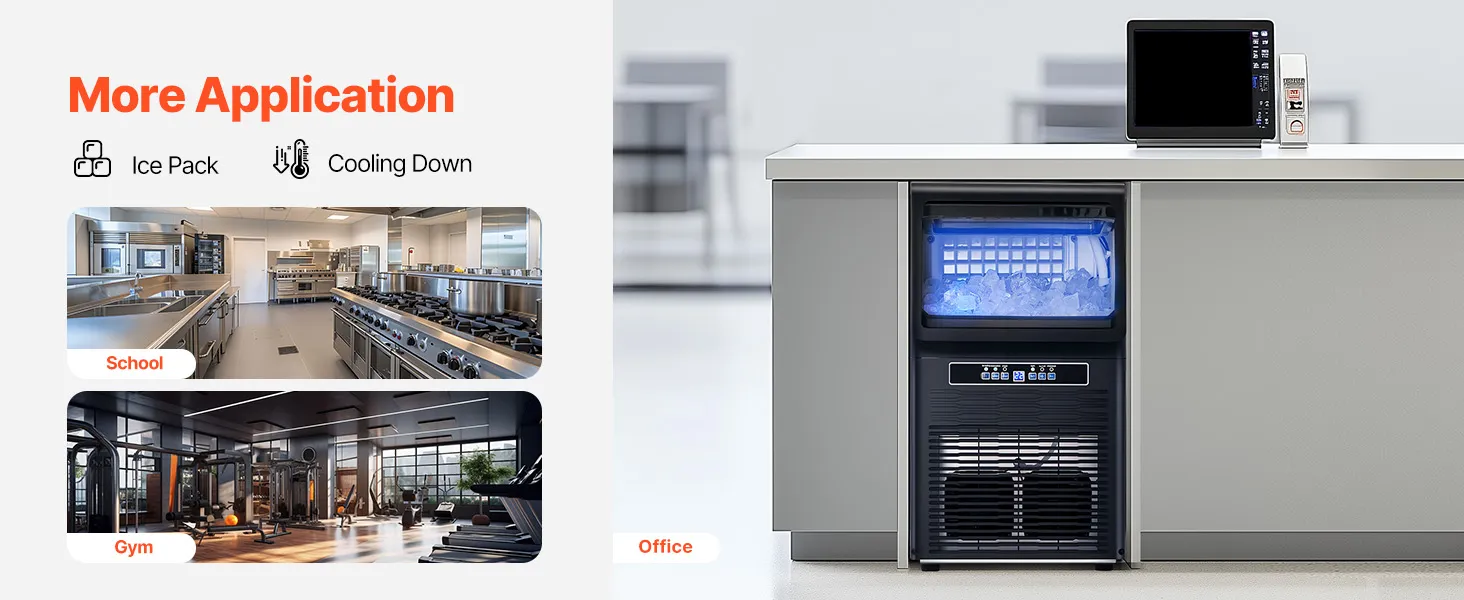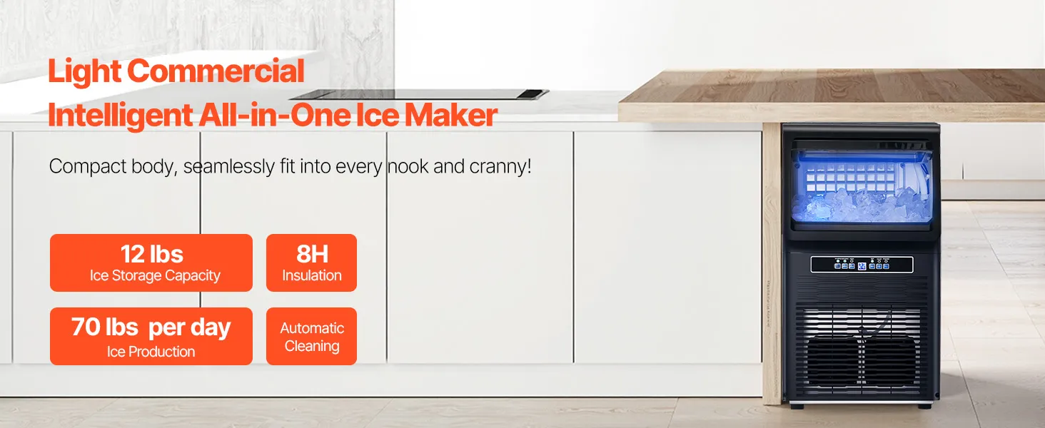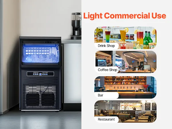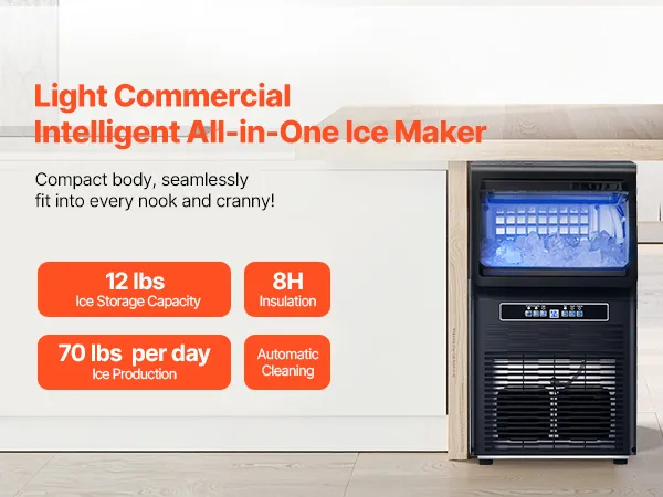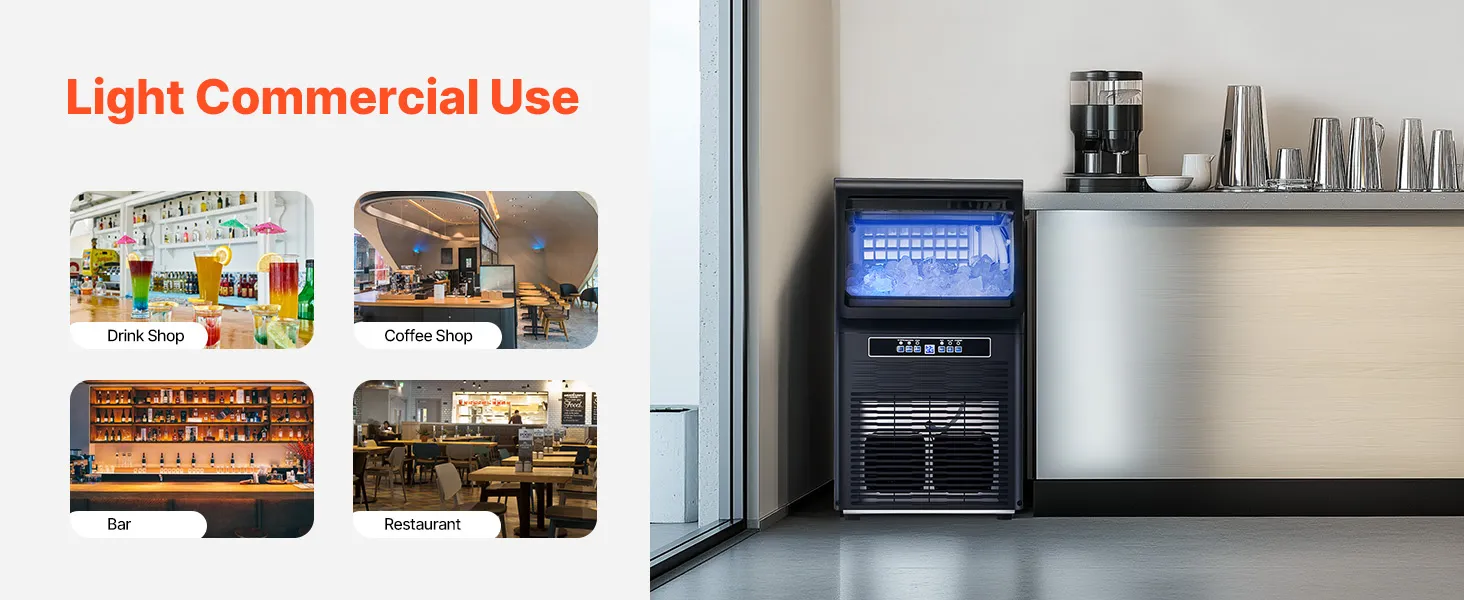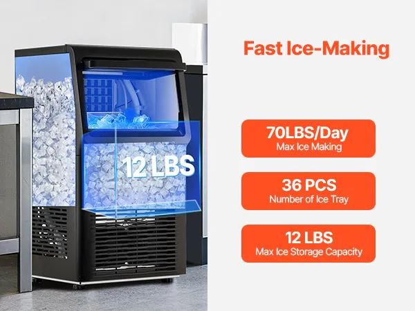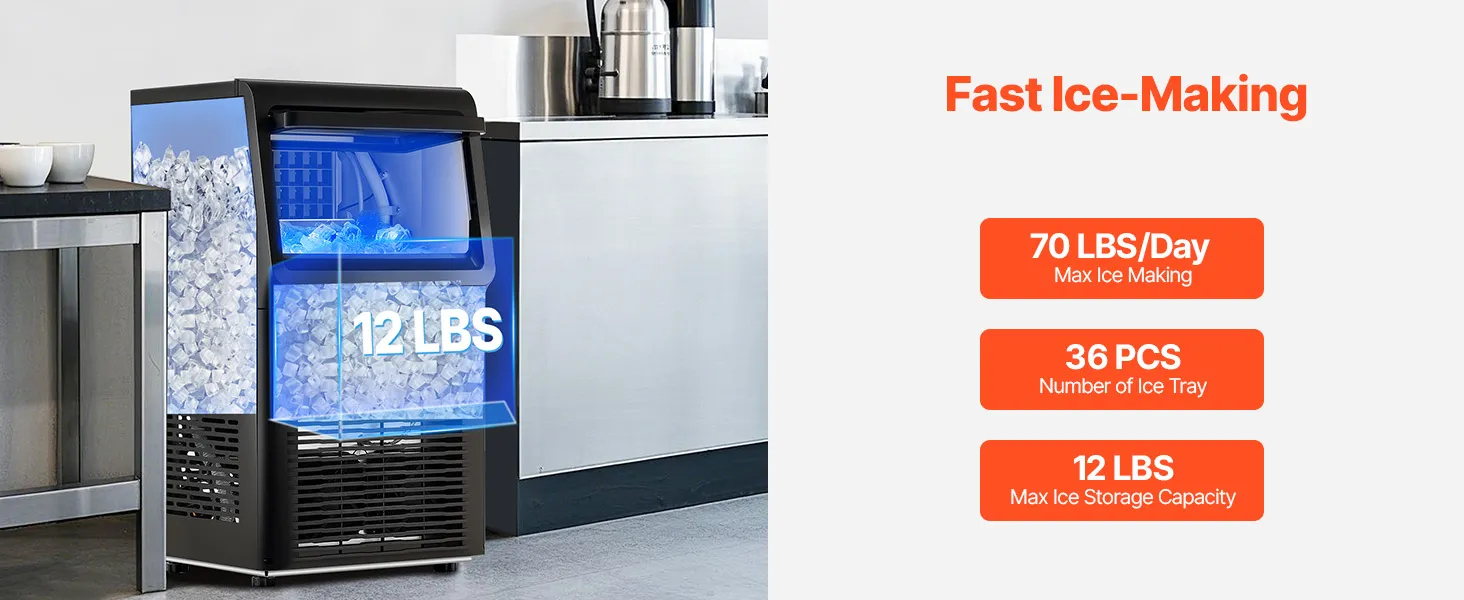 Light Commercial Ice Maker: Our commercial ice maker is designed with 36 pcs ice trays and can produce up to 70 lbs of ice cubes per day (test conditions: 50-100.4℉/10-38℃ ambient temperature). This compact ice maker has a generous storage capacity of 12 lbs and fits perfectly in your home, coffee shop, bar, beverage store, or restaurant