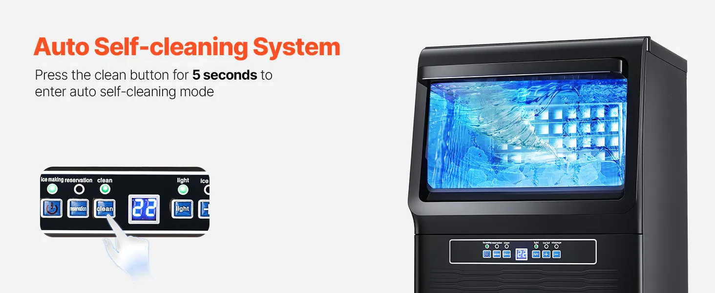 Smart Control Panel: Our commercial ice maker features an LED digital display and mechanical buttons, giving you precise control over the ice-making process. Adjust ice thickness by increasing or decreasing ice-making time effortlessly. And that's not all - it also comes with a one-touch automatic cleaning function, making machine maintenance a breeze. You can monitor the status of the ice maker in real-time with the indicator light on the panel