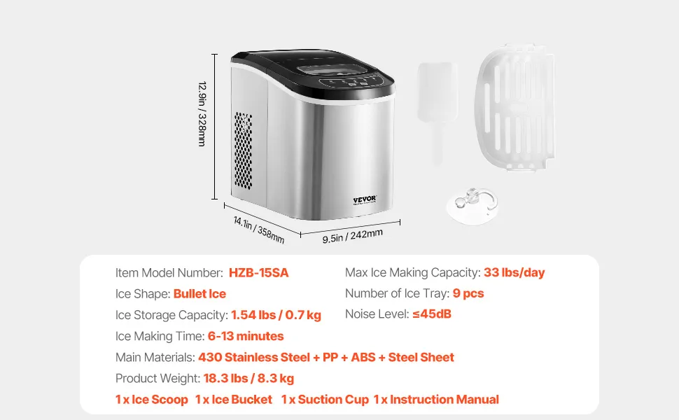 Quiet and Portable: The countertop ice machine operates at a noise level lower than 45 dB, similar to the sound of a working refrigerator. The compact design measures 9.6 x 14.2 x 12.8 inches / 245 x 360 x 325 mm, making it suitable for use in rooms, offices, restaurants, and more