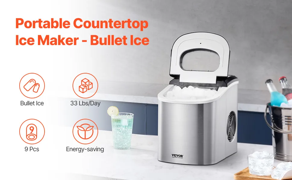 VEVOR Countertop Ice Maker, 9 Cubes Ready in 6 Mins, 33lbs in 24Hrs, Self-Cleaning Portable Ice Maker with Ice Scoop and Basket, Ice Machine with 2 Sizes Bullet Ice for Home Kitchen Office Bar Party