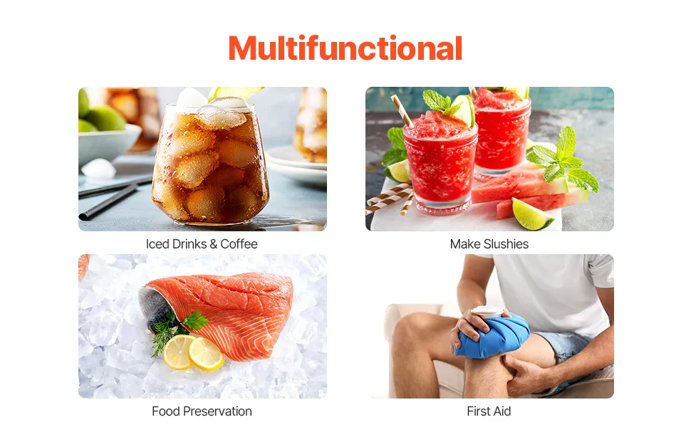 The portable ice maker is versatile, making ice for cold drinks, smoothies, and food preservation. It can even be used for first aid in emergencies.