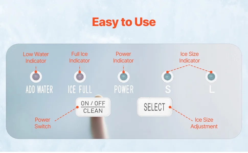 Easy to Control: The control panel of the portable ice maker is very easy to operate. Simply fill the ice maker with water, press the ON button, and select the ice cube size. The indicator light will turn on when the water level is low or the ice basket is full