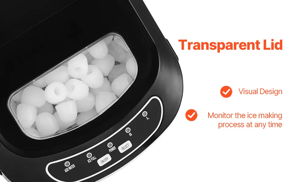 Quick Ice Maker: The countertop ice maker can produce 9 bullet ice cubes in just 6 minutes. With 2.2L / 2.3 QT of water in the tank, it can produce up to 33 pounds of ice within 24 hours. The transparent lid allows you to monitor the ice capacity