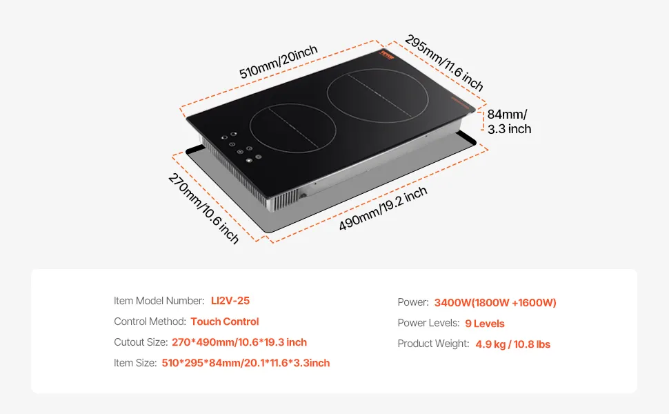 Compatible with Multiple Cookware: Compatible with 2 types of high-temperature cookware, such as cast iron and stainless steel, this electric countertop burner offers efficient cooking with 2 zones that can work simultaneously. This helps reduce heat loss while cooking.Note: Only cookware with magnetic properties can be used on this induction cooktop.