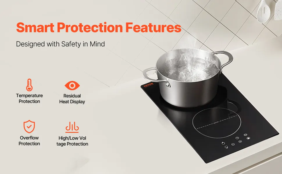 Safety Features: The kitchen induction cooktop comes equipped with features such as auto-shutoff in case of overflow, residual heat warnings to prevent burns, child lock, over- and under-voltage protection, and temperature control to ensure cooking safety. It's safe for use by pregnant women, the elderly, and families with children.