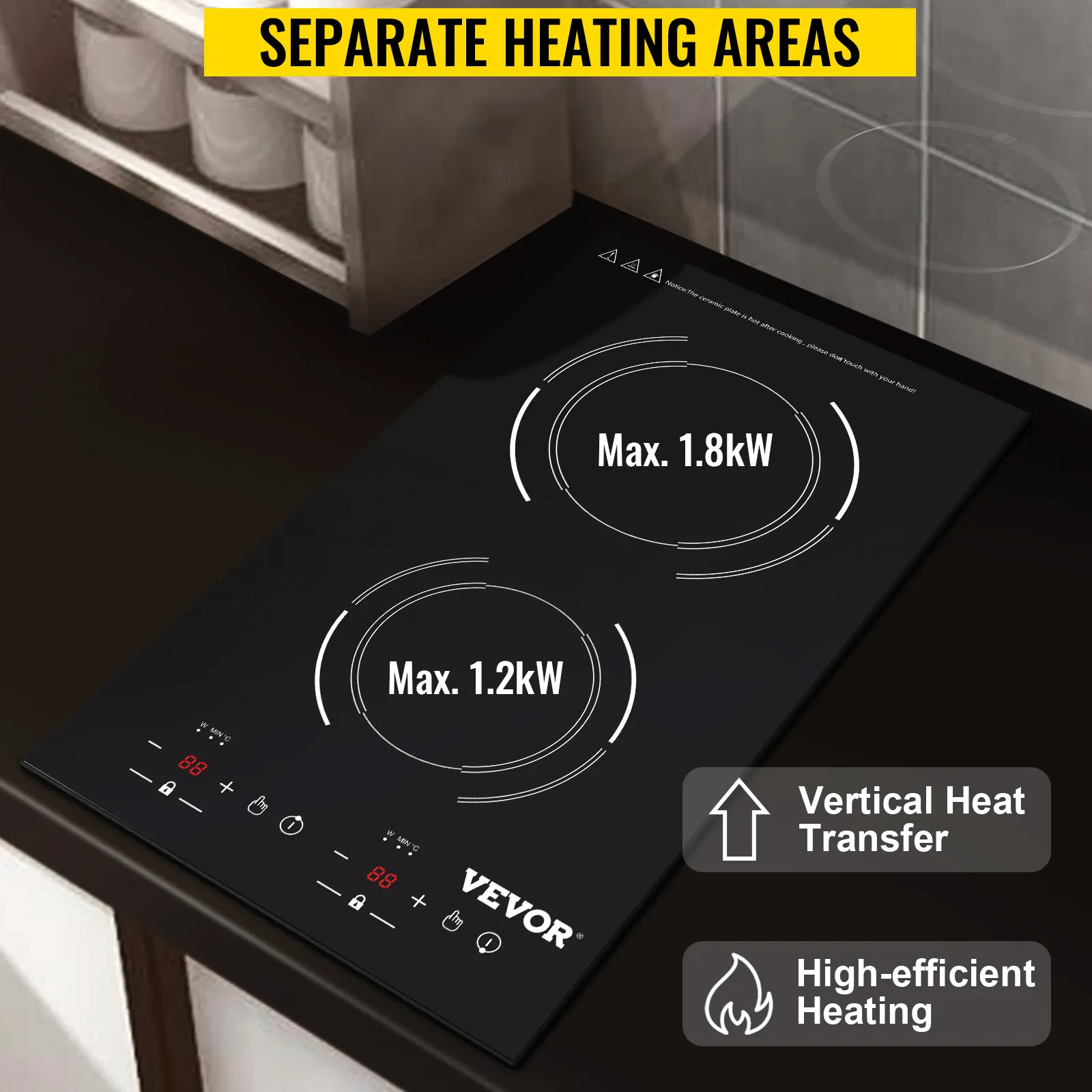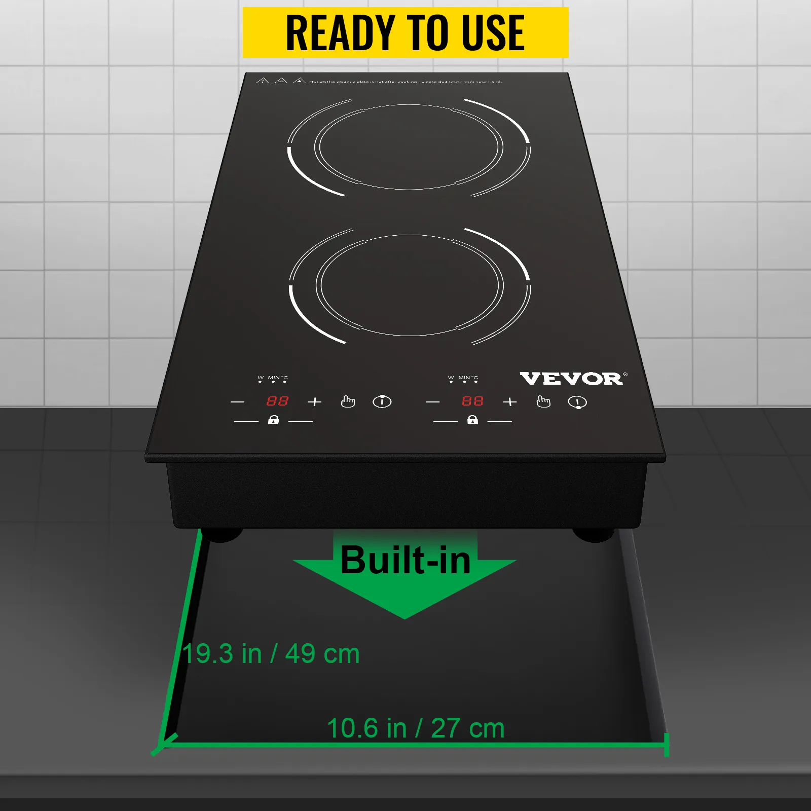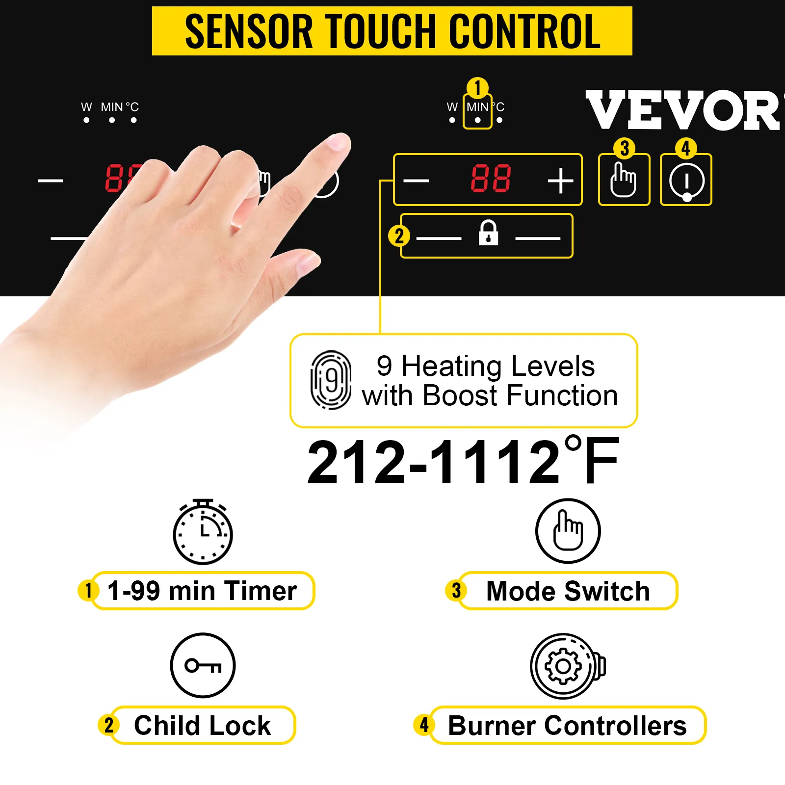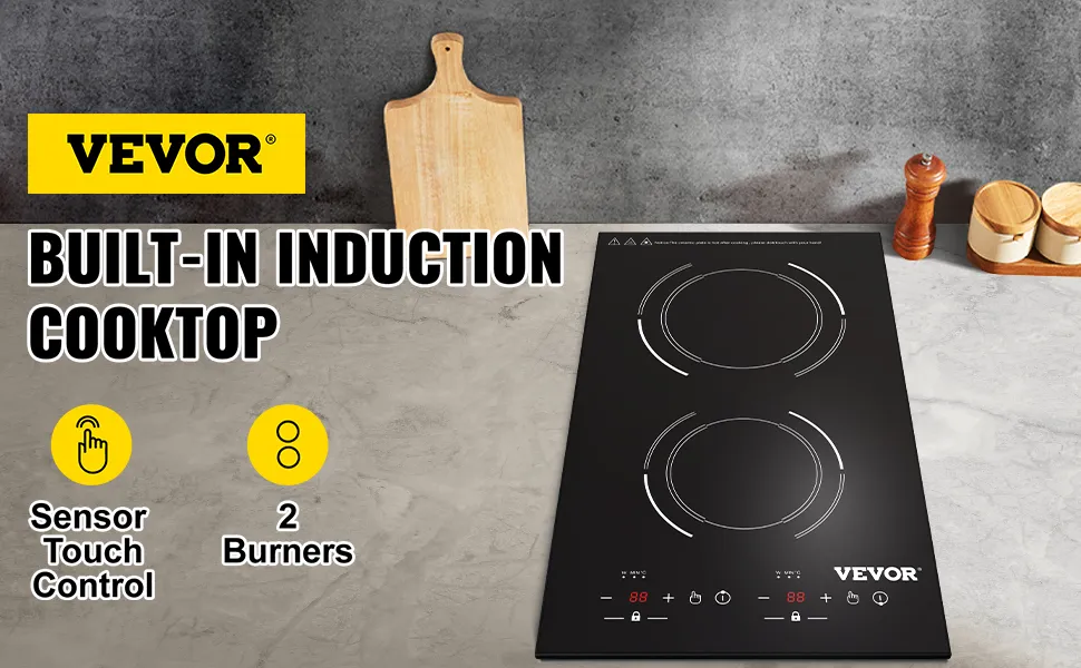 - Our induction cooktop adopts 2 burners with strong power, offering rapid and stable heating. It is equipped with sensor touch controls with 9 heating levels, a boost function, and a timer. Meanwhile, there are several measures for security, including child lock, overheat protection, auto shut-off, and a residual heat indicator. This built-in induction stovetop is going to be your number one cooking companion. Turn up the heat, outshine the competition, and get ready to turn heads with VEVOR's electric cooktop.