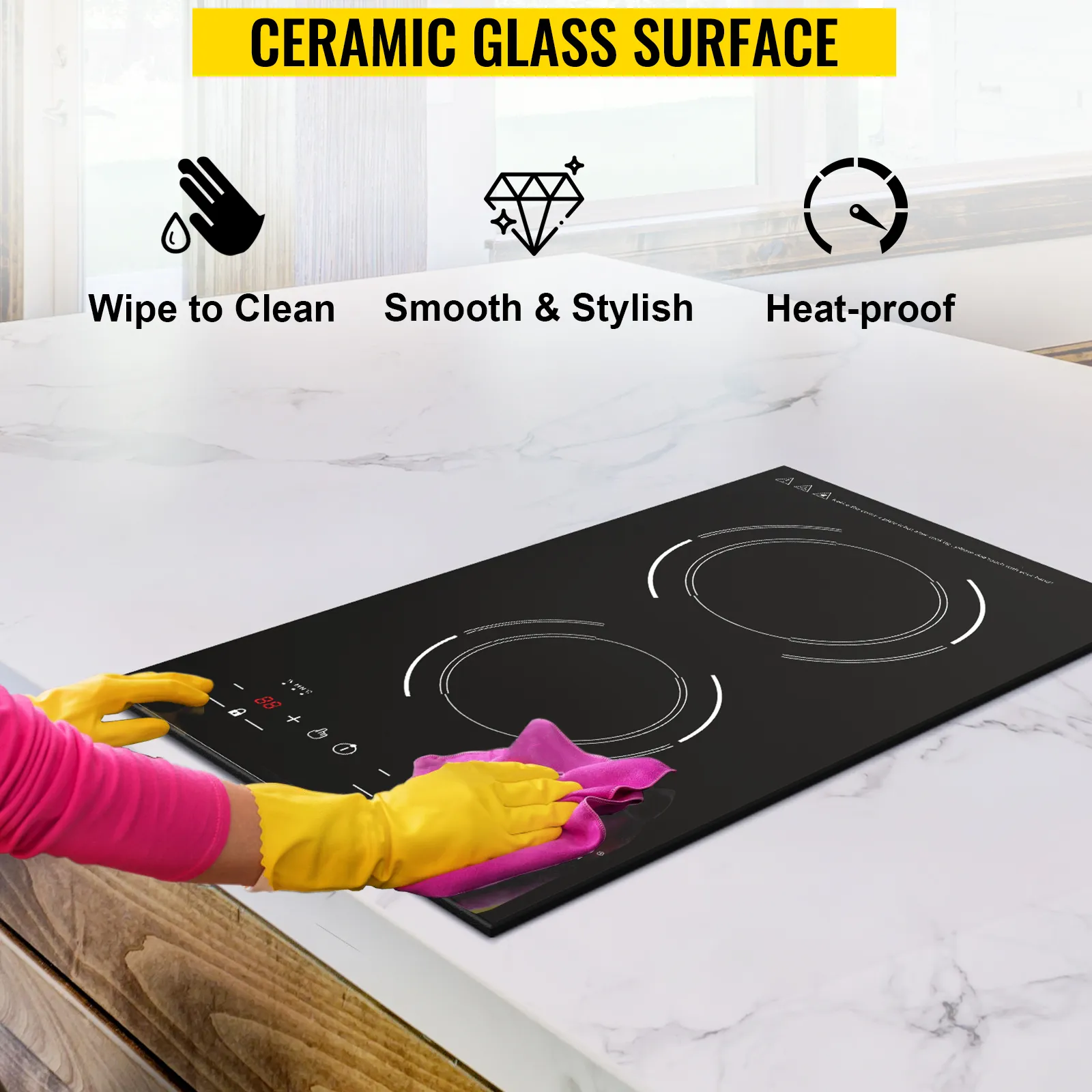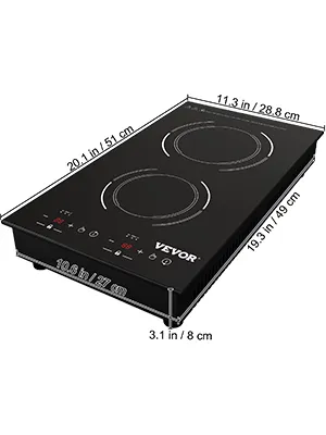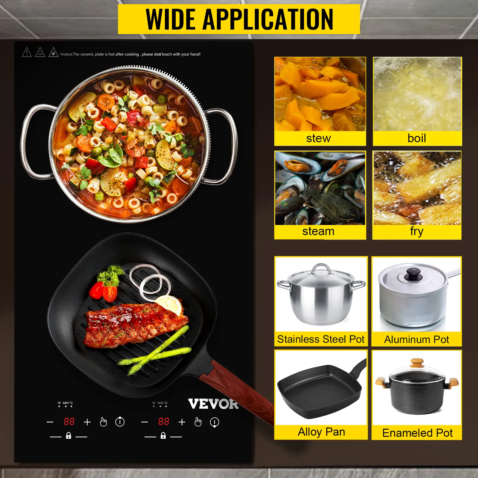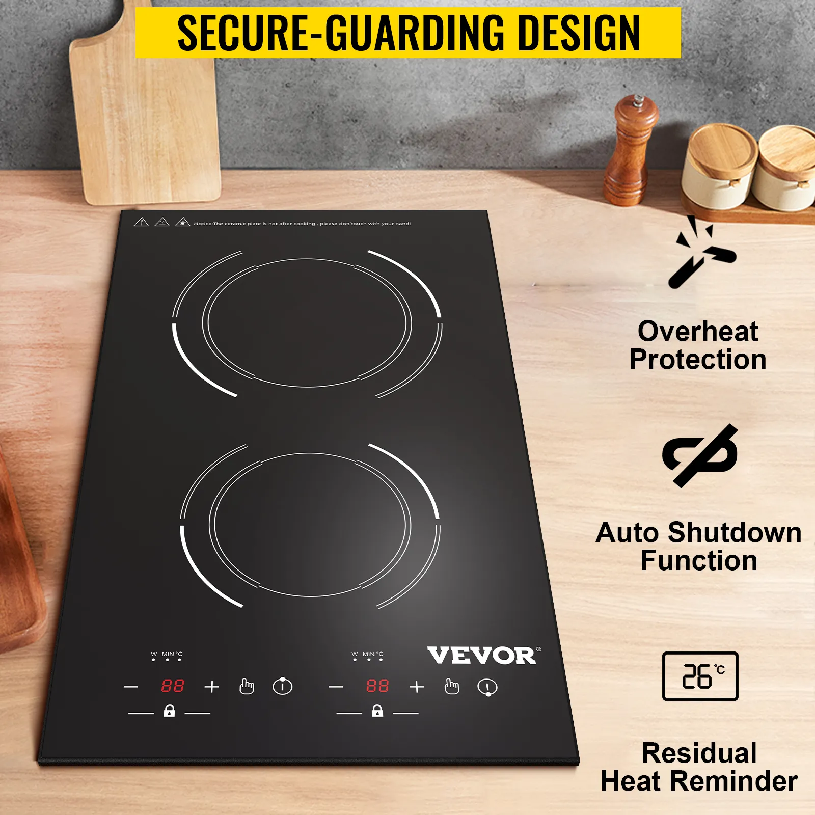 - Our induction cooktop adopts 2 burners with strong power, offering rapid and stable heating. It is equipped with sensor touch controls with 9 heating levels, a boost function, and a timer. Meanwhile, there are several measures for security, including child lock, overheat protection, auto shut-off, and a residual heat indicator. This built-in induction stovetop is going to be your number one cooking companion. Turn up the heat, outshine the competition, and get ready to turn heads with VEVOR's electric cooktop.