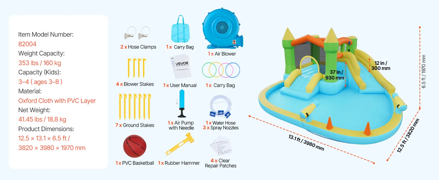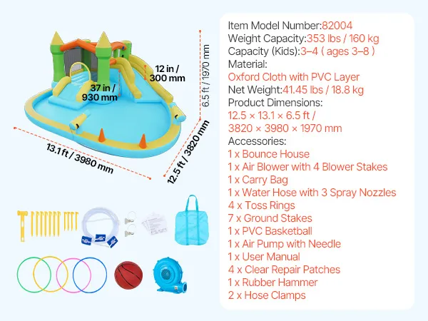 VEVOR Inflatable Bounce House, 12.5 x 13.1 x 6.5 ft Inflatable Bounce House Water Slide, Bouncer Castle with Castle Bounces, Basketball Hoop, Splash Pool & Water Ring Toss, for 3 to 4 Kids Ages 3 to 8