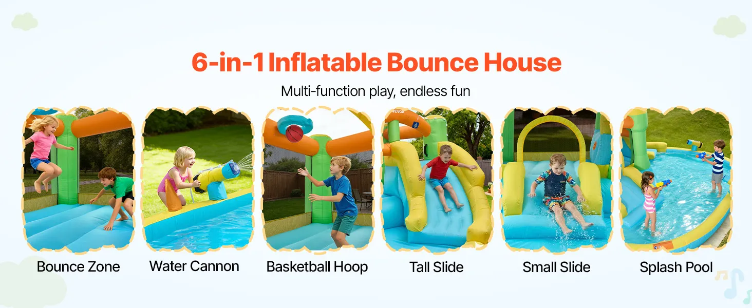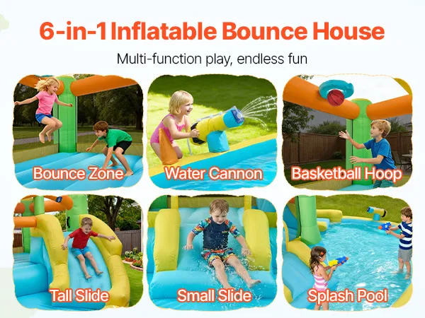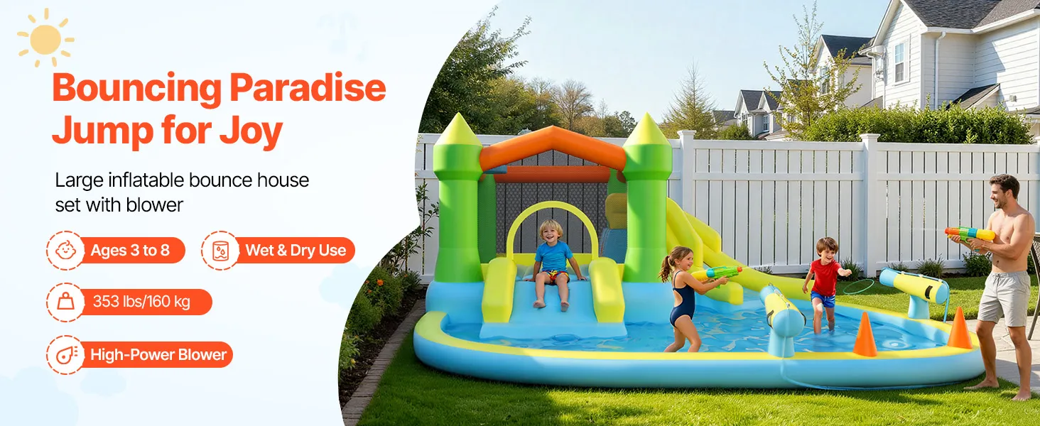 More Ways to Play: Designed with a wide bounce zone, basketball hoop, and splash pool, this wet dry water bounce brings diverse fun for children & families. The water gun delivers a steady spray of cool water, keeping the slide and pool ready for play and creating an engaging inflatable water park experience