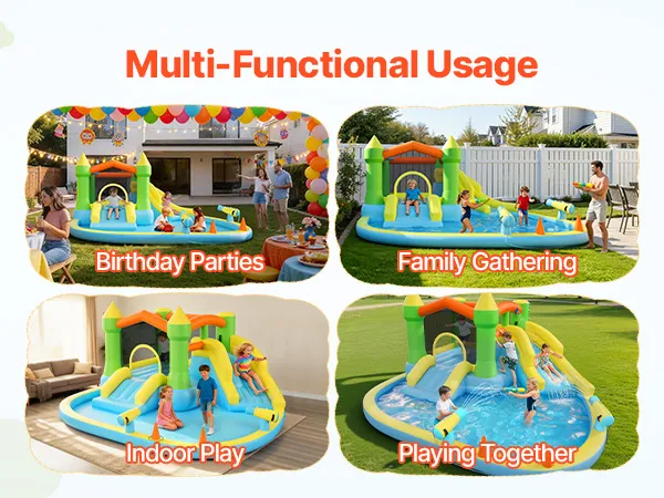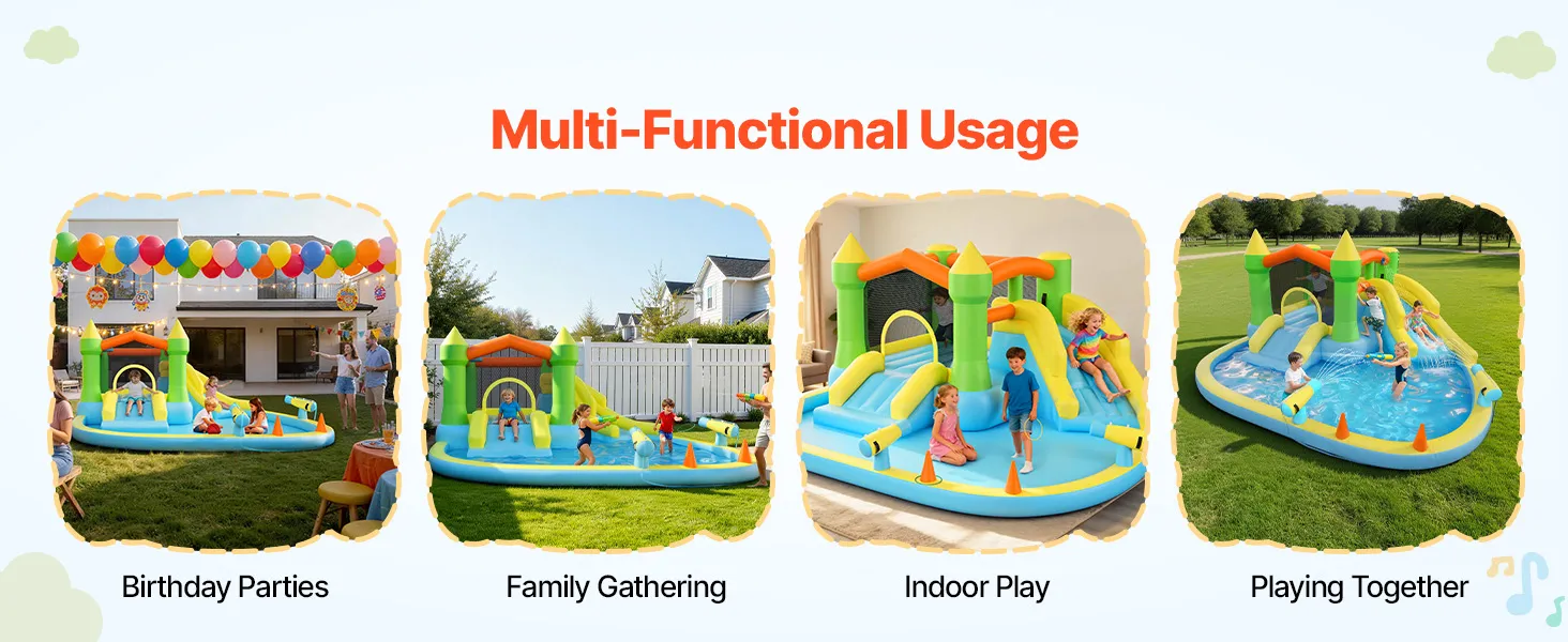 Thoughtful Design: The colorful exterior design is created to better match children's preferences and play experiences. This bounce house with water slide includes seamless adhesive repair patches for quick fixes without visual impact. Built for repeated use, it offers long-term play value for families