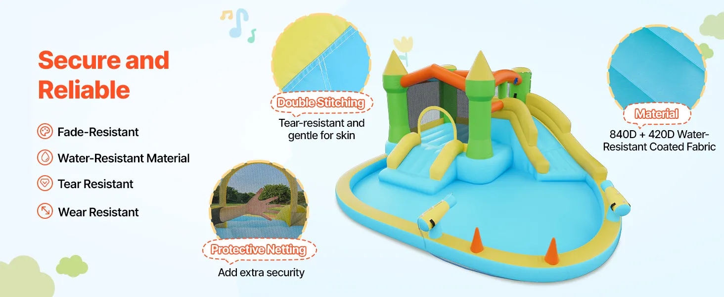 This VEVOR kids bounce house water park combines a 190T lining with a durable 840D bounce zone to support a solid overall shape. Key stress areas use double-stitch technology to improve seam strength, helping reduce openings and lowering the risk of children falling from the sides while jumping.