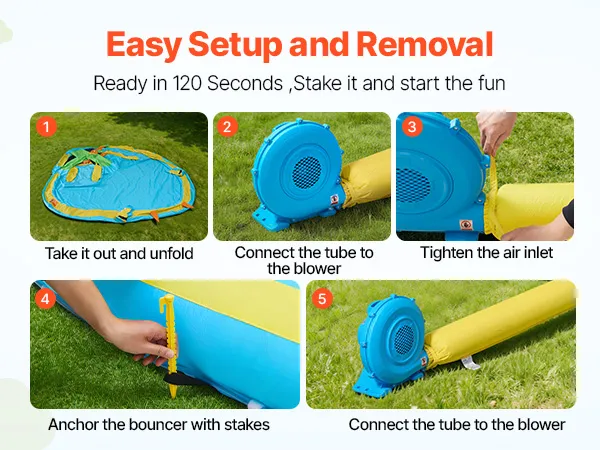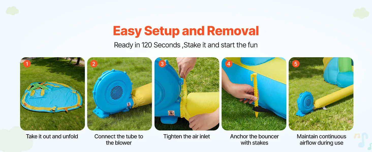 Easy to Move: This bouncy house comes with a carry handle bag for convenient transport. Installation and removal are simple, full inflation in under two minutes. Included fixing the buckles that hold the air outlet in place. Please check the ground for sharp items before laying it out
