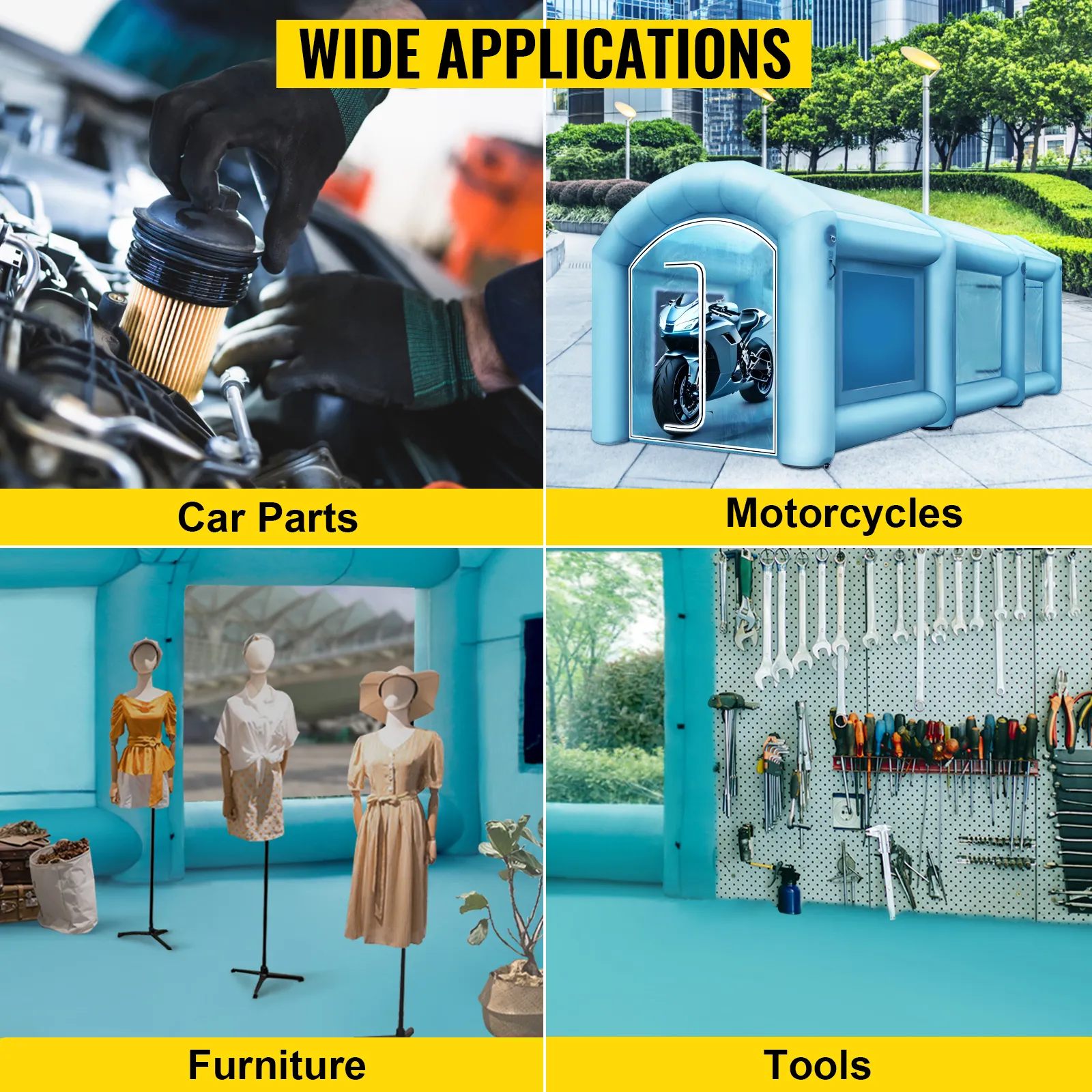 This heavy-duty inflatable mobile paint booth can be widely used to paint and repair cars, motorcycles, furniture, tools, etc.