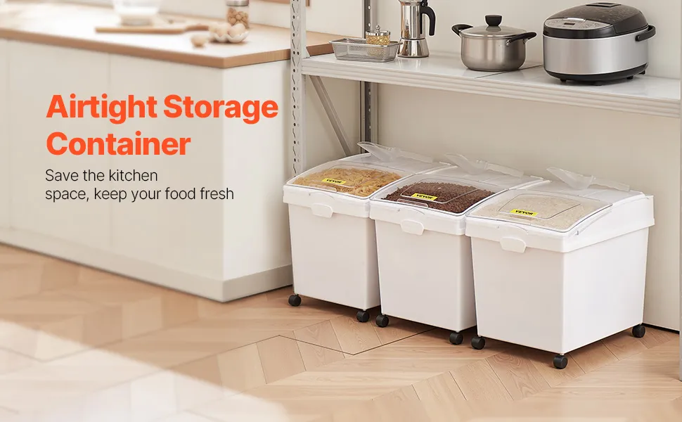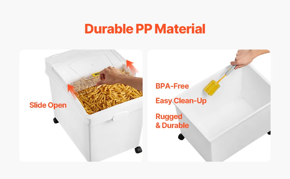 The VEVOR ingredient storage bins are perfect for storing flour and sugar. Each bin holds up to 10.5 gallons, fitting multiple bags. The bins have durable PP material, ensuring longevity. With wheels, they are easy to move around. Quick access is provided in the sliding lid design. Every bin comes with a scoop for easy measurement. Ideal for bakeries and home kitchens, these bins make storage simple and efficient. You can see the contents without opening. These bins are also stackable, saving space. All of these features keep your ingredients fresh and organized.