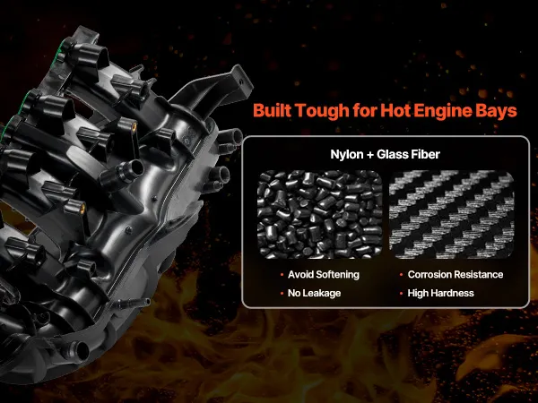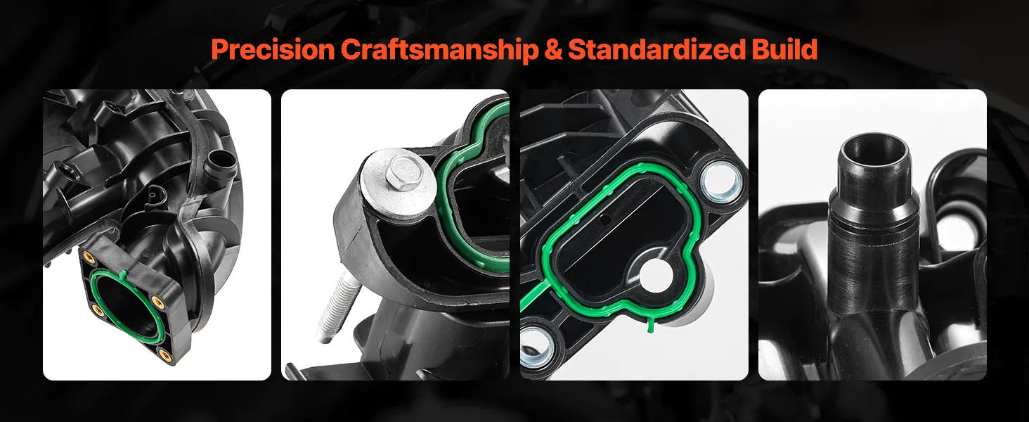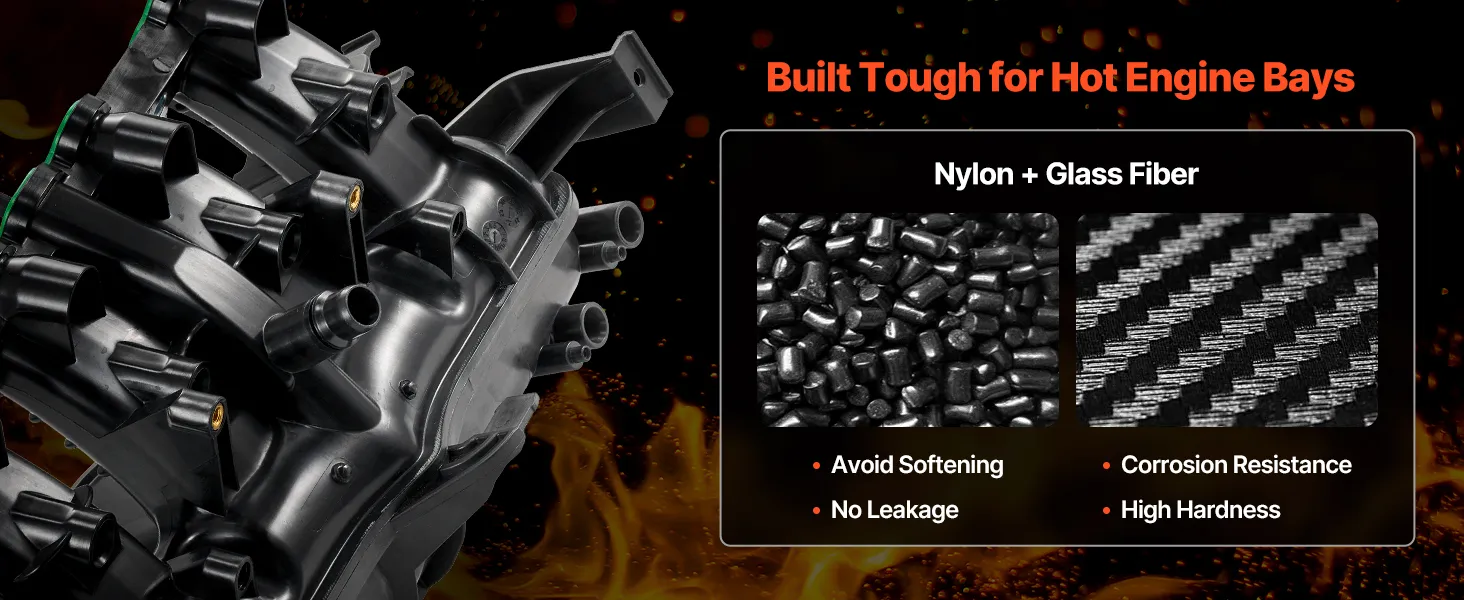 Tough, Heat-Resistant Build: The engine intake manifold replacement is crafted from reinforced nylon and glass fiber for better sealing, heat resistance, and durability. No warping, no leaks—holds up near the engine's hot zones
