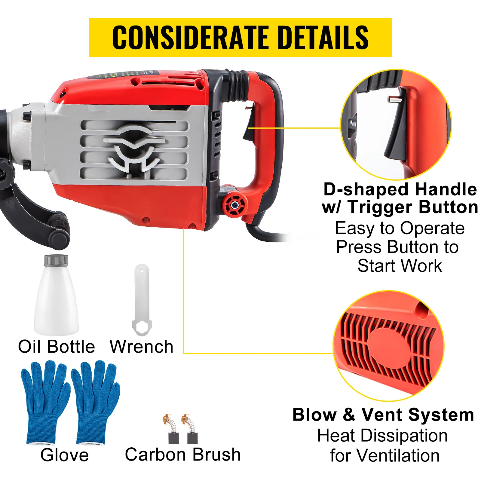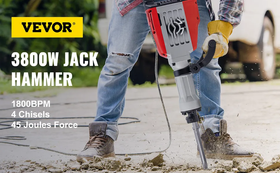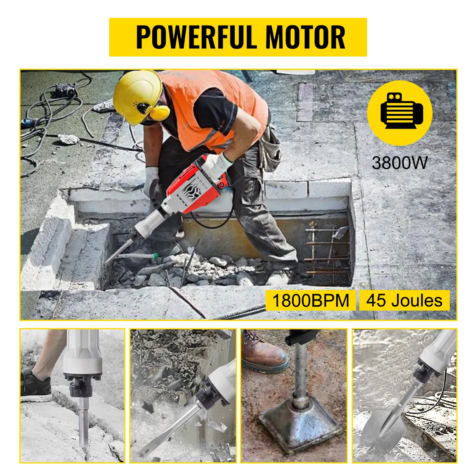 VEVOR Demolition Jack Hammer, 3800W 1800BPM, 1-1/8\" Hex Heavy Duty Concrete Breaker with 4 Chisels, Case and Gloves, 110V Industrial Electric Jackhammer for Demolishing, Chipping & Demo, CE Approved VEVOR Demolition Jack Hammer, 3800W 1800BPM, 1-1/8\" Hex Heavy Duty Concrete Breaker with 4 Chisels, Case and Gloves, 110V Industrial Electric Jackhammer for Demolishing, Chipping & Demo, CE Approved