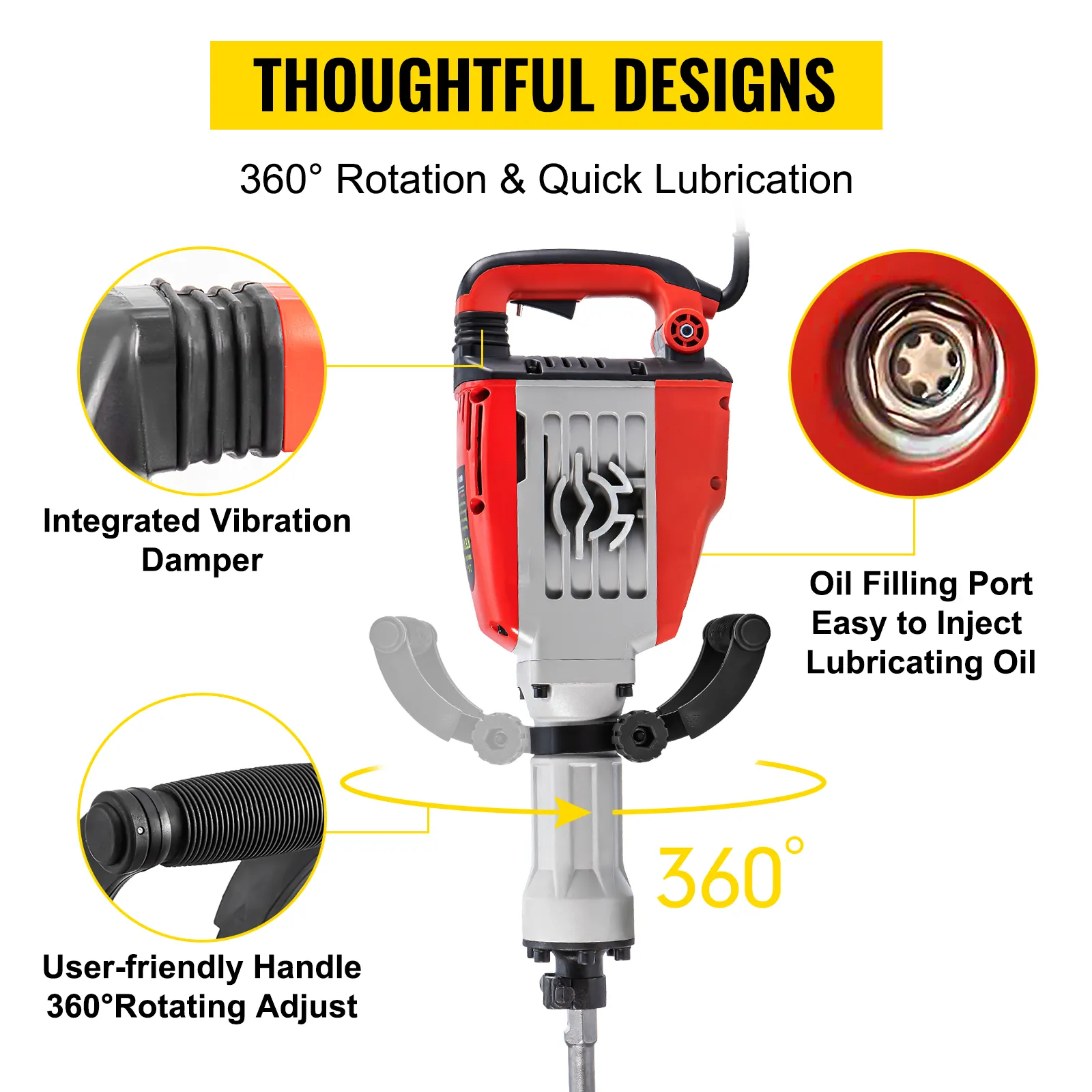 • 360° Rotary & Vibration-proof Handle: Adjustable 360 degree fore-grip provides extra control that makes the jackhammer easy to adjust to the position you need. The slip-proof rubber handle greatly enhances friction and reduces vibration to achieve complete control of the hammer with comfort.