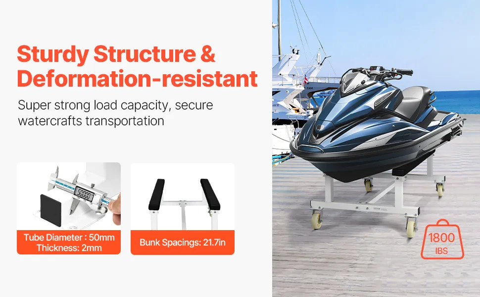 High Load Capacity: This jet ski cart features a steel structure with a 1.4 inches thickened tube diameter, providing a load capacity of up to 1800lbs. The I-beam base ensures high stability and avoids deformation, staying durable for long-term use.