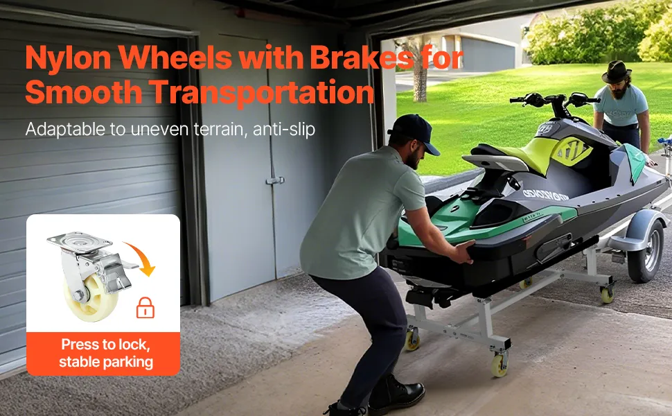 The heavy-duty jet ski cart features 360° nylon wheels for smooth, flexible steering, even with heavy loads. The carbon steel frame and ball bearings enhance load capacity, while two braked wheels provide added stability during transfers for secure movement.