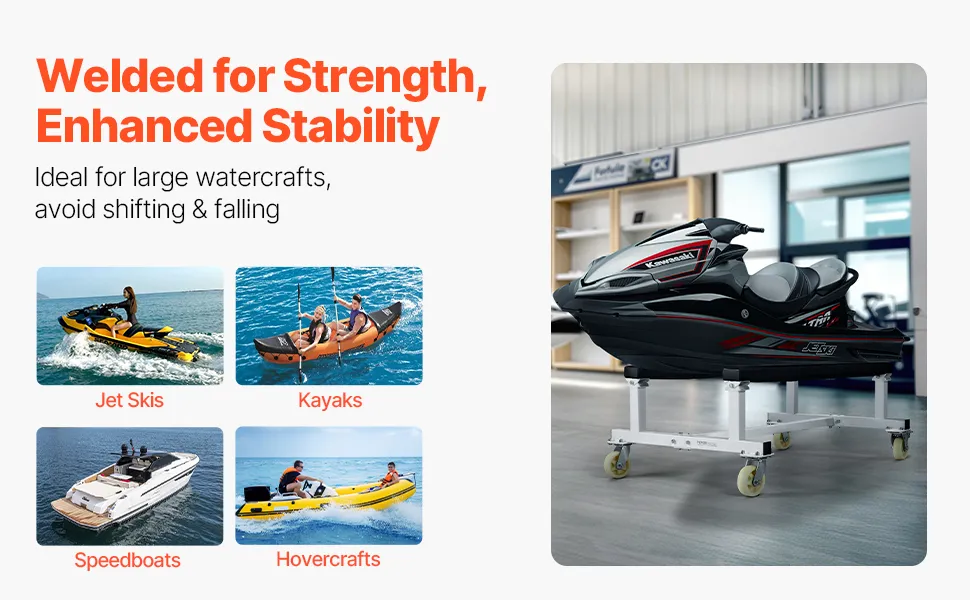 The welded bunk and support tubes with a fixed 22 inches spacing ensure high stability and load capacity, avoiding wobbling during storage or transport. The jet ski dolly cart is ideal for carrying mid-to-large boats and is also perfect for display in jet ski shops.