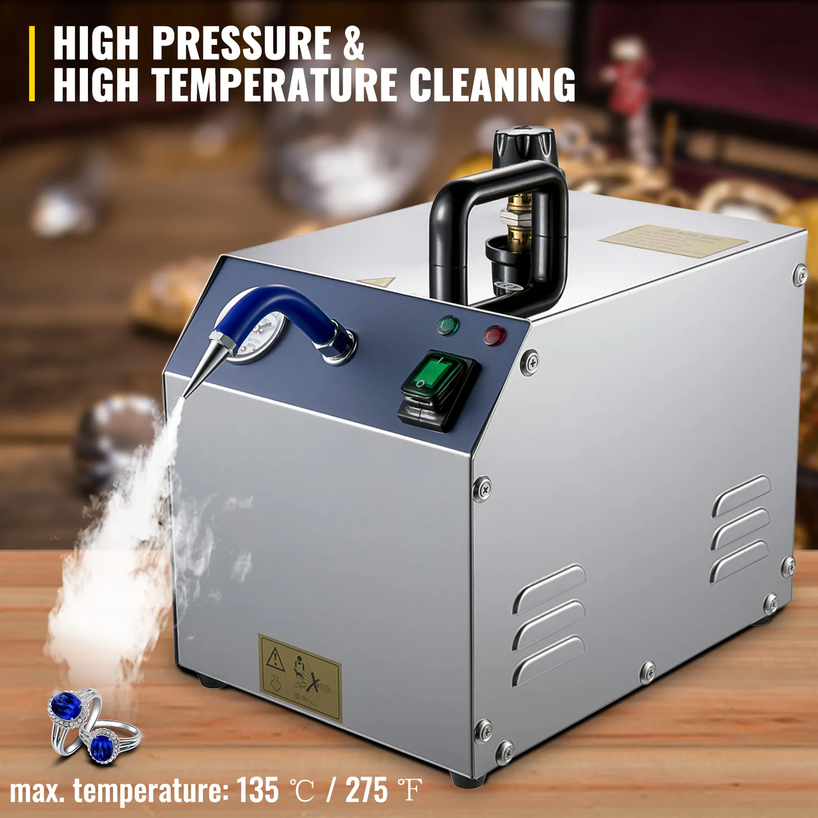 【EXCELLENT PERFORMANCE】 - The jewelry steam cleaning machine produces steam at a pressure of 4 bar to make the temperature of the injected saturated steam reach above 135℃, ensuring the touch between the steam and each angle of inlaid products for high-efficiency cleaning.
