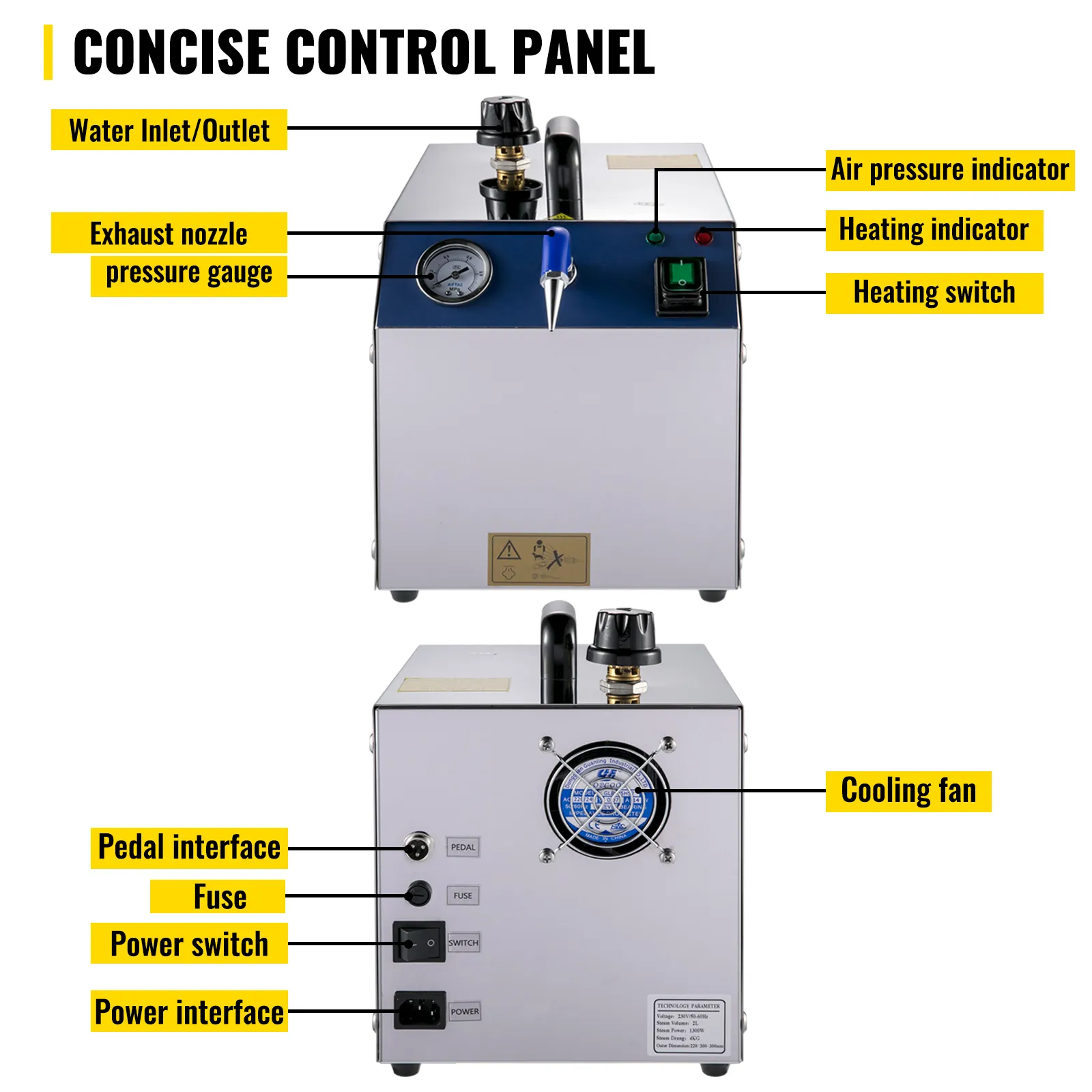 Connect the foot pedal directly to the jack at the back of the cleaner, and you can control and adjust the outlet jet. And the cooling fan provides rapid heat dissipation for long-time running.