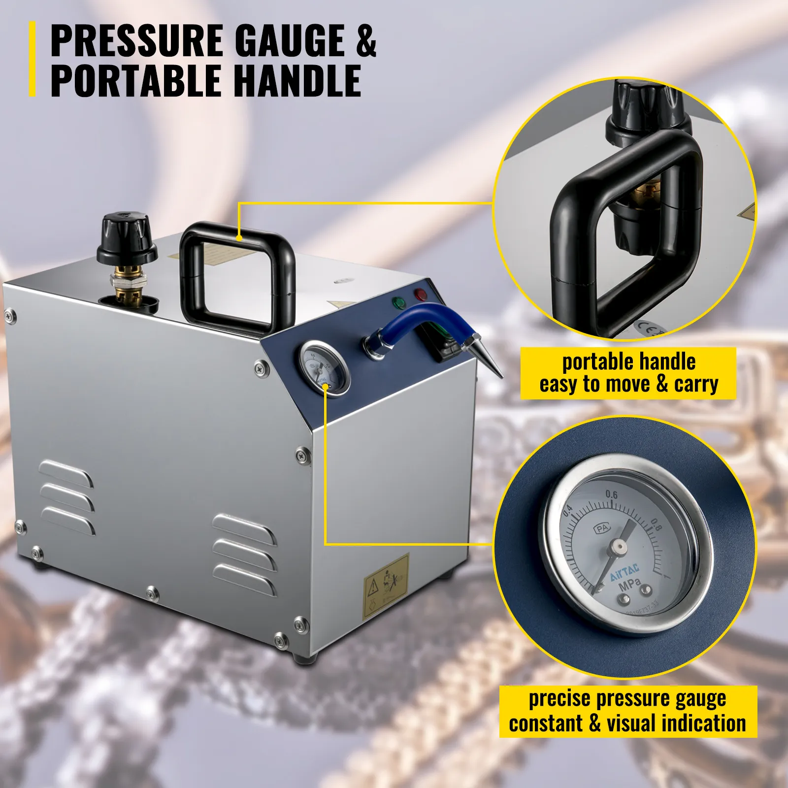 The precise pressure gauge gives you a constant & visual indication of the machine's internal pressure. And the portable handle is easy to move and carry the ring cleaner.