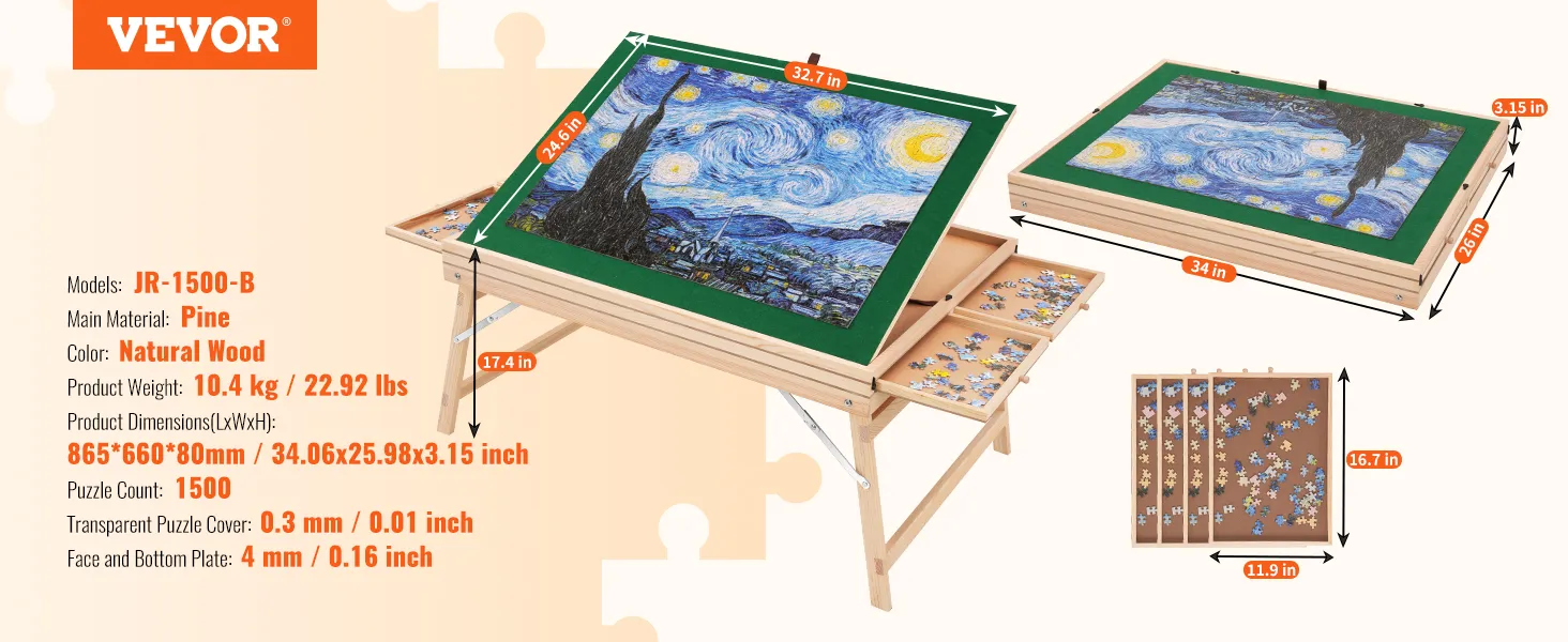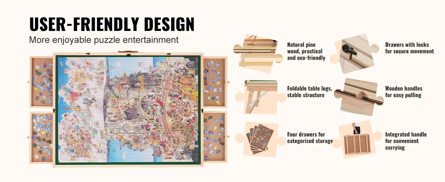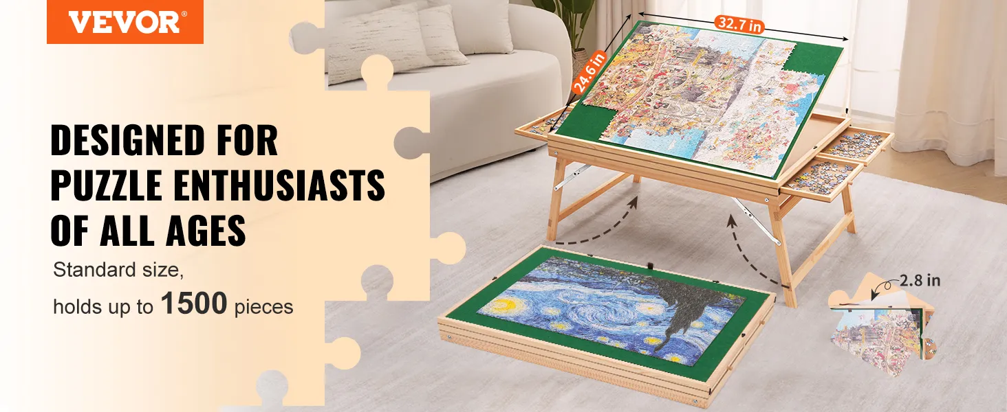 The VEVOR puzzle table with folding legs is perfect for any setting. The foldable legs make it easy to store under a sofa or bed. This table is made from pine, which is strong and reliable. You can comfortably use it on sand, carpet, or anything else. Easy to move and adjust: It's ideal for family gatherings, friends' parties, or just spending time with your kids. Have and enjoy a hygienic puzzle-making experience using this versatile table!