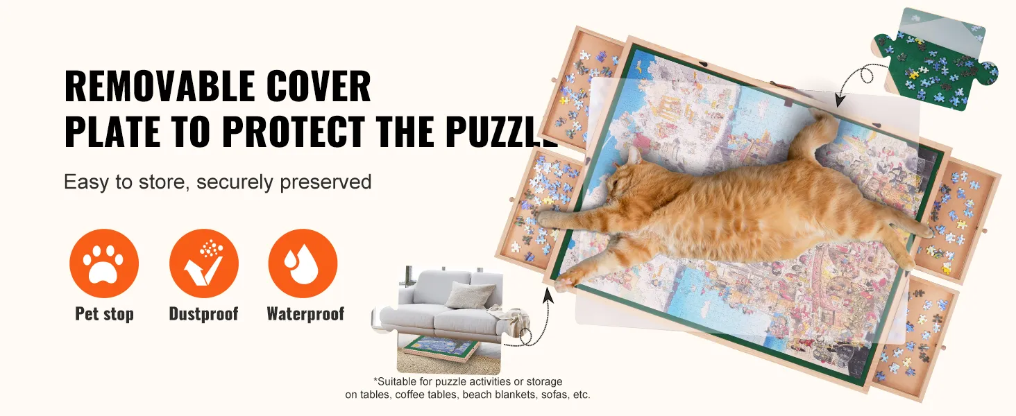 This puzzle storage system has transparent PP cover plate protects your work from dust and water. It also prevents pets from scattering puzzle pieces. When you complete your masterpiece, you can store the puzzle board under the sofa, on a table, or on the floor. The cover plate is great for people who need to take breaks or stop their puzzle-solving sessions. The clear PP cover plate is perfect for those who require a break or need to pause their puzzle-solving session.