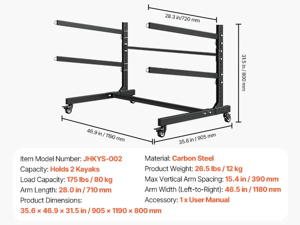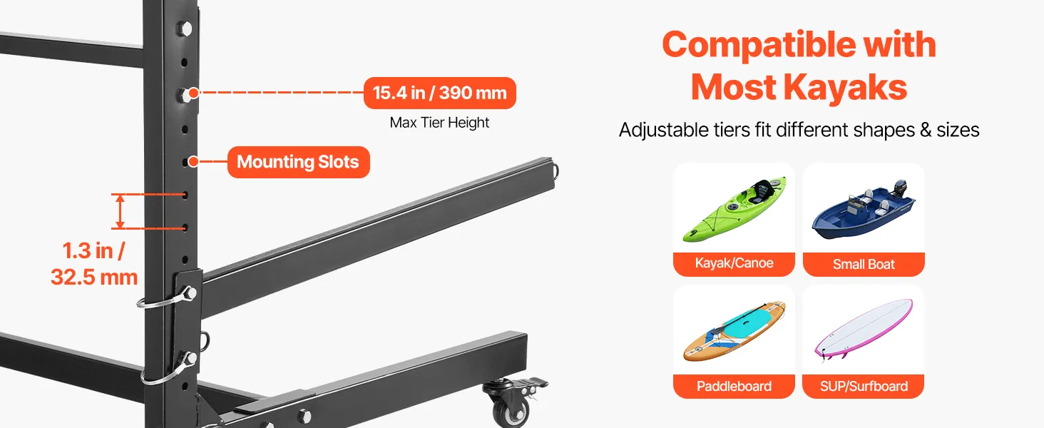 2 Kayaks & Adjustable: Store 2 kayaks, canoes, or SUPs with this kayak storage rack. It features an adjustable tiered design with up to 15.4" of vertical spacing and 28" long arms, giving ample room for wide kayaks without hull stress